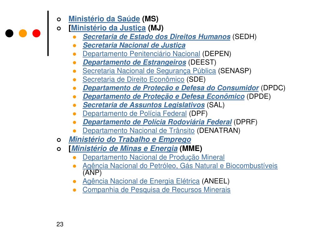 Ministério da Saúde (MS) • [Ministério da Justiça (MJ) • Secretaria de Estado dos Direitos Humanos (SEDH) • Secretaria Nacional de Justiça • Departamento Penitenciário Nacional (DEPEN) • Departamento de Estrangeiros (DEEST) • Secretaria Nacional de Segurança Pública (SENASP) • Secretaria de Direito Econômico (SDE) • Departamento de Proteção e Defesa do Consumidor (DPDC) • Departamento de Proteção e Defesa Econômico (DPDE) • Secretaria de Assuntos Legislativos (SAL) • Departamento de Polícia Federal (DPF) • Departamento de Polícia Rodoviária Federal (DPRF) • Departamento Nacional de Trânsito (DENATRAN) • Ministério do Trabalho e Emprego • [Ministério de Minas e Energia (MME) • Departamento Nacional de Produção Mineral • Agência Nacional do Petróleo, Gás Natural e Biocombustíveis (ANP) • Agência Nacional de Energia Elétrica (ANEEL) • Companhia de Pesquisa de Recursos Minerais