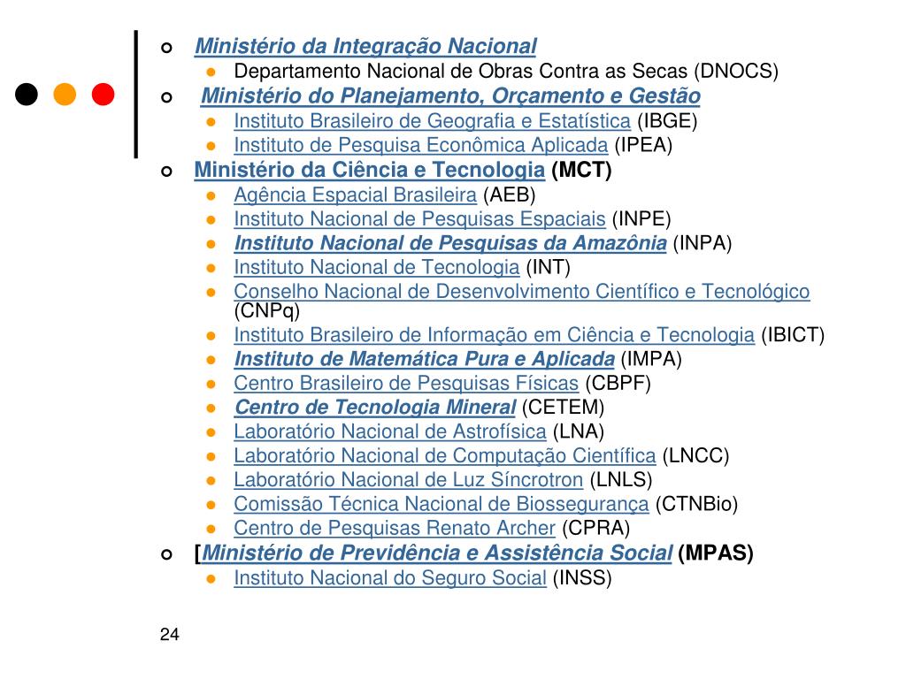 Ministério da Integração Nacional • Departamento Nacional de Obras Contra as Secas (DNOCS) • Ministério do Planejamento, Orçamento e Gestão • Instituto Brasileiro de Geografia e Estatística (IBGE) • Instituto de Pesquisa Econômica Aplicada (IPEA) • Ministério da Ciência e Tecnologia (MCT) • Agência Espacial Brasileira (AEB) • Instituto Nacional de Pesquisas Espaciais (INPE) • Instituto Nacional de Pesquisas da Amazônia (INPA) • Instituto Nacional de Tecnologia (INT) • Conselho Nacional de Desenvolvimento Científico e Tecnológico (CNPq) • Instituto Brasileiro de Informação em Ciência e Tecnologia (IBICT) • Instituto de Matemática Pura e Aplicada (IMPA) • Centro Brasileiro de Pesquisas Físicas (CBPF) • Centro de Tecnologia Mineral (CETEM) • Laboratório Nacional de Astrofísica (LNA) • Laboratório Nacional de Computação Científica (LNCC) • Laboratório Nacional de Luz Síncrotron (LNLS) • Comissão Técnica Nacional de Biossegurança (CTNBio) • Centro de Pesquisas Renato Archer (CPRA) • [Ministério de Previdência e Assistência Social (MPAS) • Instituto Nacional do Seguro Social (INSS)