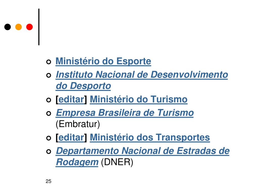 Ministério do Esporte • Instituto Nacional de Desenvolvimento do Desporto • [editar] Ministério do Turismo • Empresa Brasileira de Turismo (Embratur) • [editar] Ministério dos Transportes • Departamento Nacional de Estradas de Rodagem (DNER)