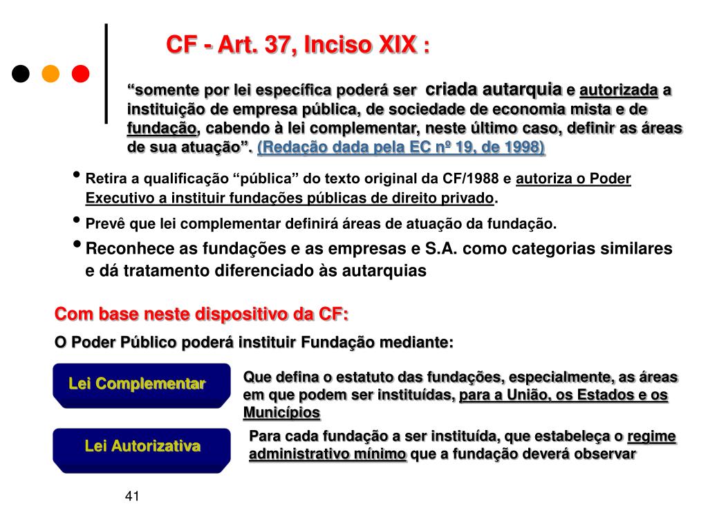 Com base neste dispositivo da CF: O Poder Público poderá instituir Fundação mediante: Que defina o estatuto das fundações, especialmente, as áreas em que podem ser instituídas, para a União, os Estados e os Municípios Lei Complementar Para cada fundação a ser instituída, que estabeleça o regime administrativo mínimo que a fundação deverá observar Lei Autorizativa CF - Art. 37, Inciso XIX : “somente por lei específica poderá ser criada autarquia e autorizada a instituição de empresa pública, de sociedade de economia mista e de fundação, cabendo à lei complementar, neste último caso, definir as áreas de sua atuação”. (Redação dada pela EC nº 19, de 1998) • Retira a qualificação “pública” do texto original da CF/1988 e autoriza o Poder Executivo a instituir fundações públicas de direito privado. • Prevê que lei complementar definirá áreas de atuação da fundação. • Reconhece as fundações e as empresas e S.A. como categorias similares e dá tratamento diferenciado às autarquias