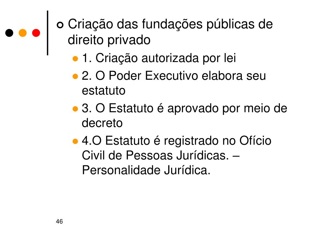 Criação das fundações públicas de direito privado • 1. Criação autorizada por lei • 2. O Poder Executivo elabora seu estatuto • 3. O Estatuto é aprovado por meio de decreto • 4.O Estatuto é registrado no Ofício Civil de Pessoas Jurídicas. – Personalidade Jurídica.