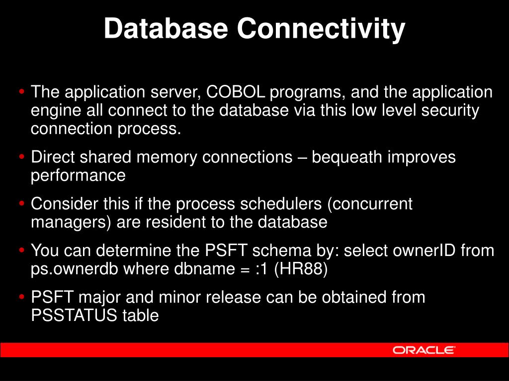 Database Connectivity • The application server, COBOL programs, and the application engine all connect to the database via this low level security connection process. • Direct shared memory connections – bequeath improves performance • Consider this if the process schedulers (concurrent managers) are resident to the database • You can determine the PSFT schema by: select ownerID from ps.ownerdb where dbname = :1 (HR88) • PSFT major and minor release can be obtained from PSSTATUS table