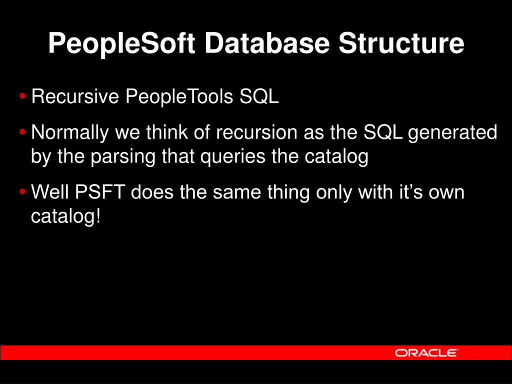 PeopleSoft Database Structure • Recursive PeopleTools SQL • Normally we think of recursion as the SQL generated by the parsing that queries the catalog • Well PSFT does the same thing only with it’s own catalog!