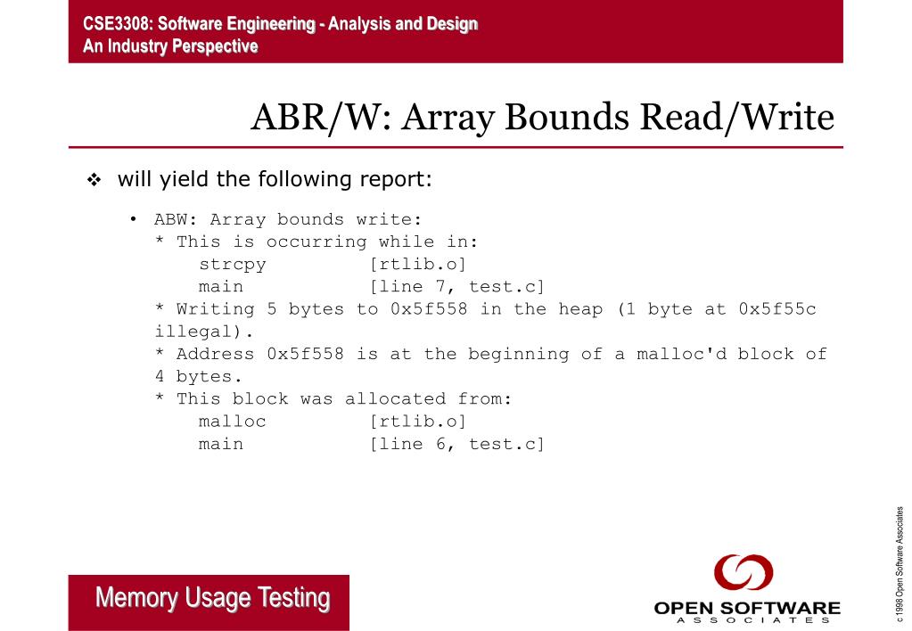 ABR/W: Array Bounds Read/Write • will yield the following report: • ABW: Array bounds write:* This is occurring while in: strcpy [rtlib.o] main [line 7, test.c]* Writing 5 bytes to 0x5f558 in the heap (1 byte at 0x5f55c illegal).* Address 0x5f558 is at the beginning of a malloc'd block of 4 bytes.* This block was allocated from: malloc [rtlib.o] main [line 6, test.c] Memory Usage Testing