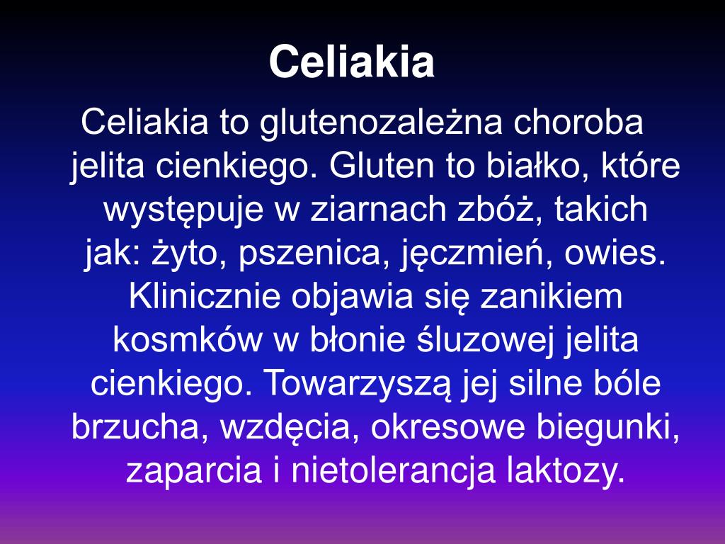 Celiakia Celiakia to glutenozależna choroba jelita cienkiego. Gluten to białko, które występuje w ziarnach zbóż, takich jak: żyto, pszenica, jęczmień, owies. Klinicznie objawia się zanikiem kosmków w błonie śluzowej jelita cienkiego. Towarzyszą jej silne bóle brzucha, wzdęcia, okresowe biegunki, zaparcia i nietolerancja laktozy.