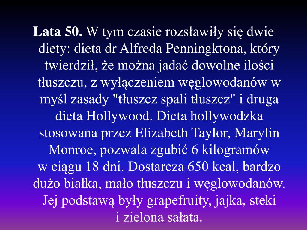 Lata 50. W tym czasie rozsławiły się dwie diety: dieta dr Alfreda Penningktona, który twierdził, że można jadać dowolne ilości tłuszczu, z wyłączeniem węglowodanów w myśl zasady "tłuszcz spali tłuszcz" i druga dieta Hollywood. Dieta hollywodzka stosowana przez Elizabeth Taylor, Marylin Monroe, pozwala zgubić 6 kilogramów w ciągu 18 dni. Dostarcza 650 kcal, bardzo dużo białka, mało tłuszczu i węglowodanów. Jej podstawą były grapefruity, jajka, steki i zielona sałata.