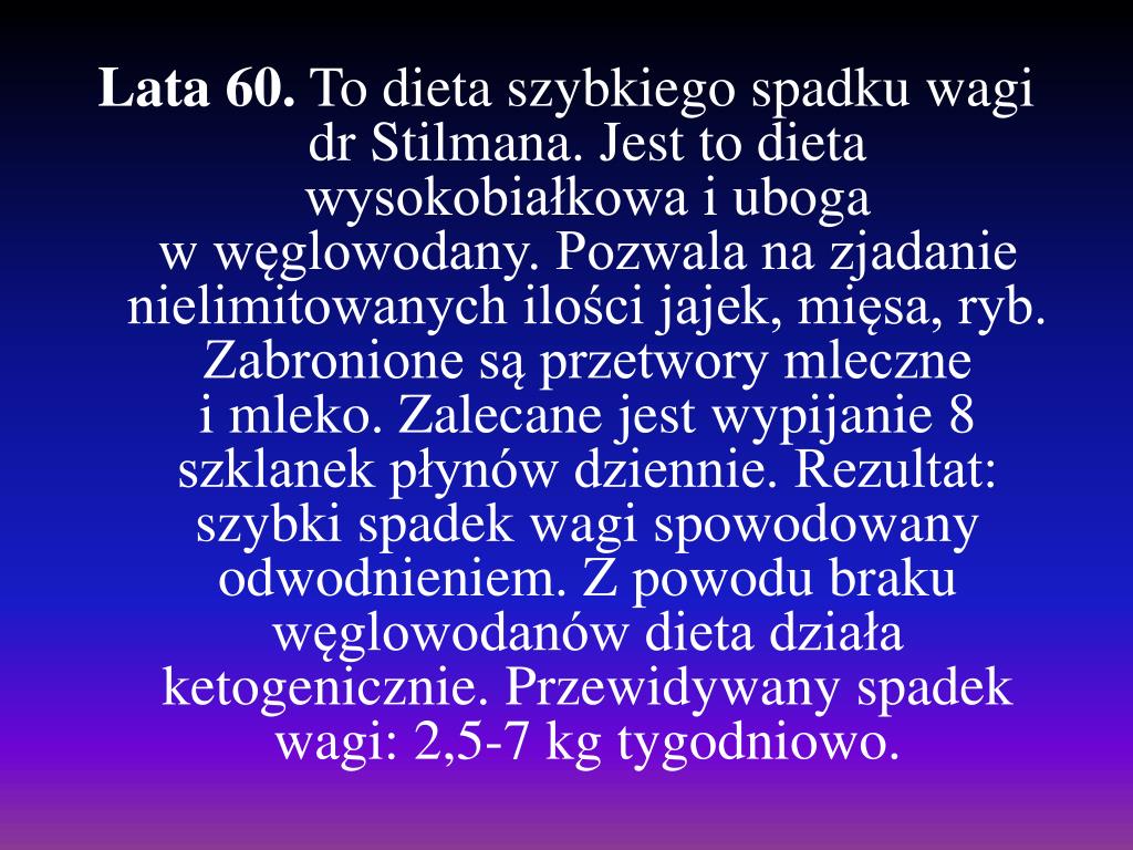 Lata 60. To dieta szybkiego spadku wagi dr Stilmana. Jest to dieta wysokobiałkowa i uboga w węglowodany. Pozwala na zjadanie nielimitowanych ilości jajek, mięsa, ryb. Zabronione są przetwory mleczne i mleko. Zalecane jest wypijanie 8 szklanek płynów dziennie. Rezultat: szybki spadek wagi spowodowany odwodnieniem. Z powodu braku węglowodanów dieta działa ketogenicznie. Przewidywany spadek wagi: 2,5-7 kg tygodniowo.