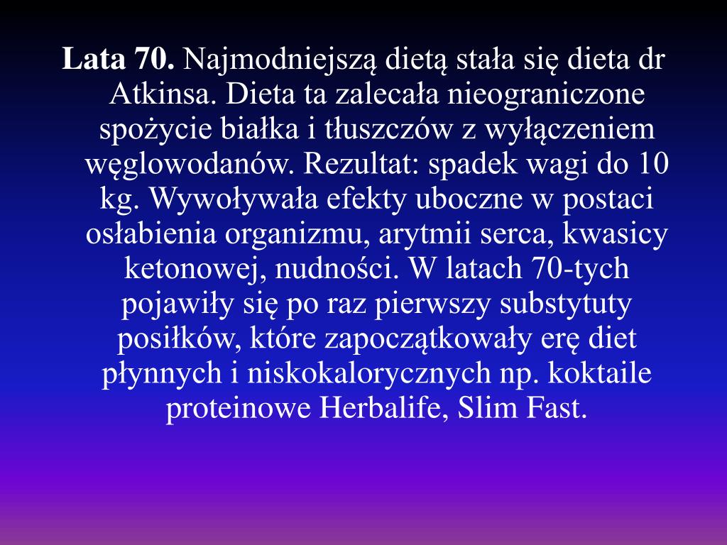 Lata 70. Najmodniejszą dietą stała się dieta dr Atkinsa. Dieta ta zalecała nieograniczone spożycie białka i tłuszczów z wyłączeniem węglowodanów. Rezultat: spadek wagi do 10 kg. Wywoływała efekty uboczne w postaci osłabienia organizmu, arytmii serca, kwasicy ketonowej, nudności. W latach 70-tych pojawiły się po raz pierwszy substytuty posiłków, które zapoczątkowały erę diet płynnych i niskokalorycznych np. koktaile proteinowe Herbalife, Slim Fast.
