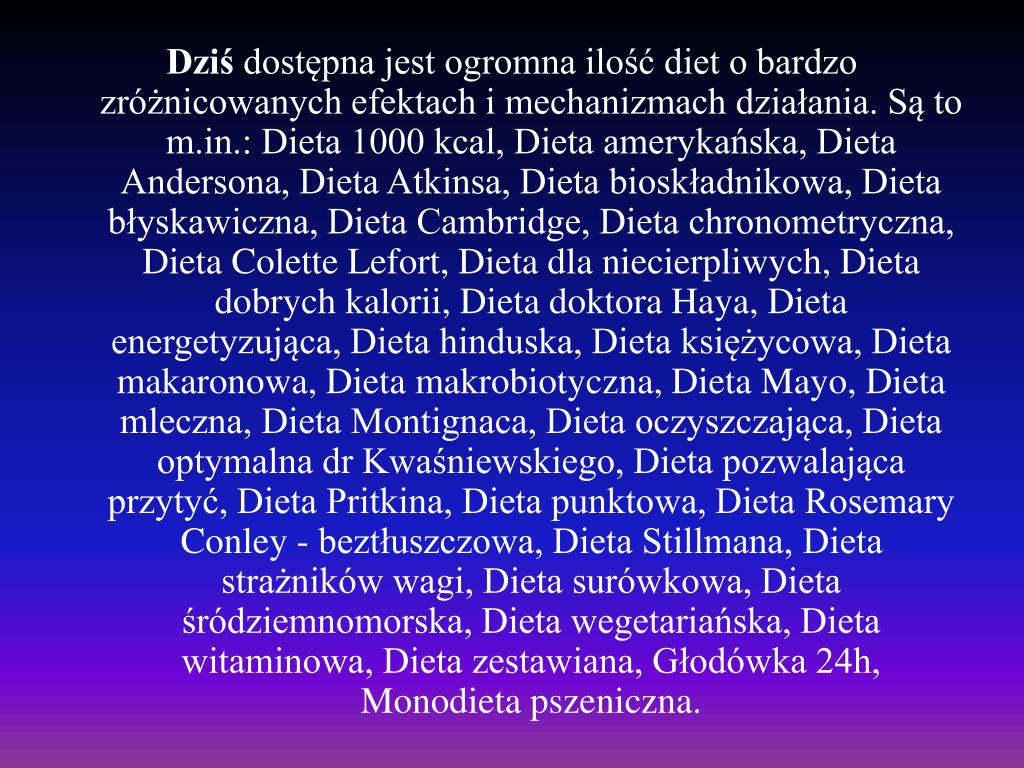 Historia Do końca lat 40. Diety nie były układane przez specjalistów. Obiecywały szybkie chudnięcie przy objadaniu się ulubionymi smakołykami. Diety były wysokobiałkowe i wysokotłuszczowe praktycznie bez węglowodanów. Skuteczność żadna.