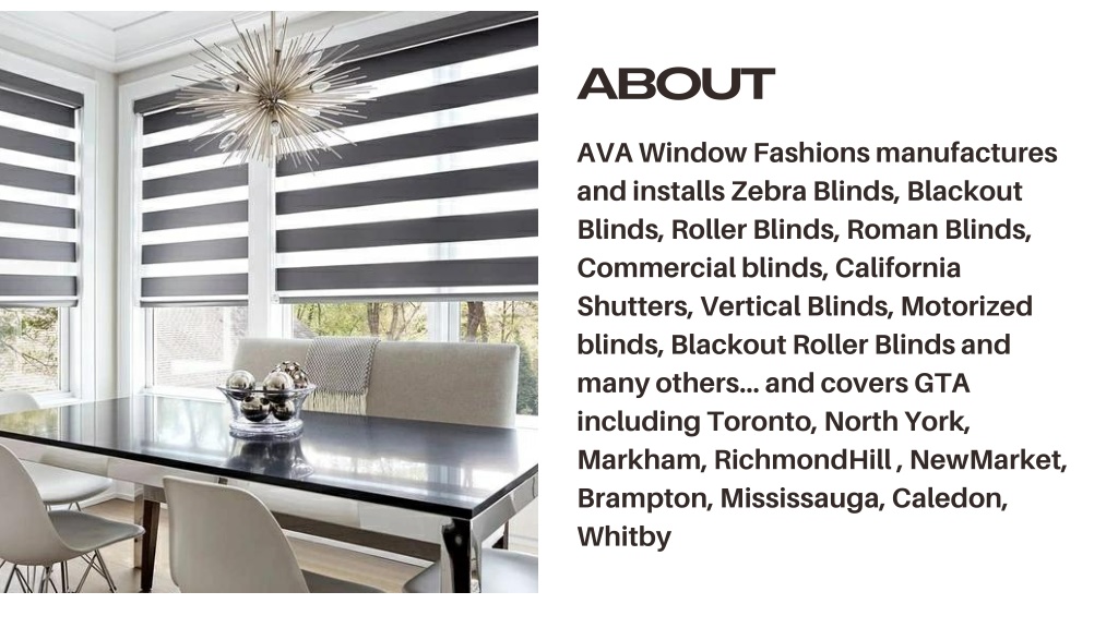 ABOUT AVA Window Fashions manufactures and installs Zebra Blinds, Blackout Blinds, Roller Blinds, Roman Blinds, Commercial blinds, California Shutters, Vertical Blinds, Motorized blinds, Blackout Roller Blinds and many others… and covers GTA including Toronto, North York, Markham, RichmondHill , NewMarket, Brampton, Mississauga, Caledon, Whitby