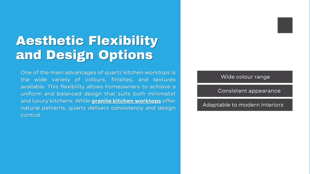 Aesthetic Flexibility Aesthetic Flexibility and Design Options and Design Options One of the main advantages of quartz kitchen worktops is the wide variety of colours, finishes, and textures available. This flexibility allows homeowners to achieve a uniform and balanced design that suits both minimalist and luxury kitchens. While granite kitchen worktops offer natural patterns, quartz delivers consistency and design One of the main advantages of quartz kitchen worktops is the wide variety of colours, finishes, and textures available. This flexibility allows homeowners to achieve a uniform and balanced design that suits both minimalist and luxury kitchens. While granite kitchen worktops offer natural patterns, quartz delivers consistency and design control. control. Wide colour range Wide colour range Consistent appearance Consistent appearance Adaptable to modern interiors Adaptable to modern interiors