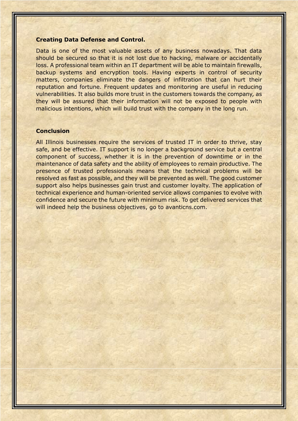 Creating Data Defense and Control. Data is one of the most valuable assets of any business nowadays. That data should be secured so that it is not lost due to hacking, malware or accidentally loss. A professional team within an IT department will be able to maintain firewalls, backup systems and encryption tools. Having experts in control of security matters, companies eliminate the dangers of infiltration that can hurt their reputation and fortune. Frequent updates and monitoring are useful in reducing vulnerabilities. It also builds more trust in the customers towards the company, as they will be assured that their information will not be exposed to people with malicious intentions, which will build trust with the company in the long run. Conclusion All Illinois businesses require the services of trusted IT in order to thrive, stay safe, and be effective. IT support is no longer a background service but a central component of success, whether it is in the prevention of downtime or in the maintenance of data safety and the ability of employees to remain productive. The presence of trusted professionals means that the technical problems will be resolved as fast as possible, and they will be prevented as well. The good customer support also helps businesses gain trust and customer loyalty. The application of technical experience and human-oriented service allows companies to evolve with confidence and secure the future with minimum risk. To get delivered services that will indeed help the business objectives, go to avanticns.com.