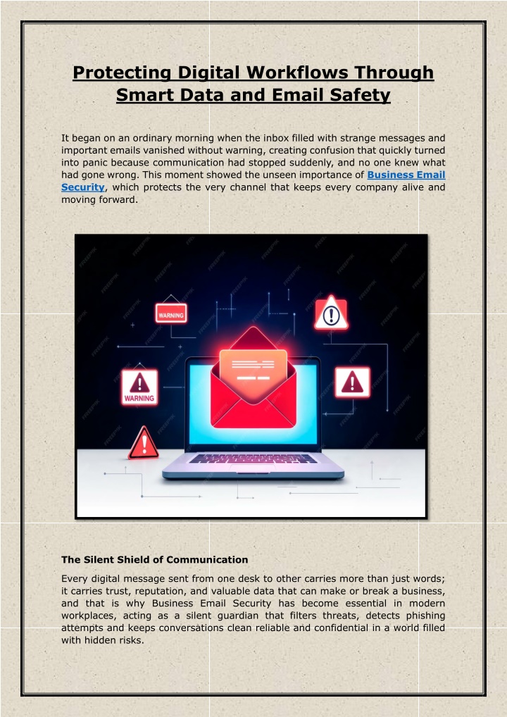 1. Protecting Digital Workflows Through Smart Data and Email Safety It began on an ordinary morning when the inbox filled with strange messages and important emails vanished without warning, creating confusion that quickly turned into panic because communication had stopped suddenly, and no one knew what had gone wrong. This moment showed the unseen importance ofBusiness Email Security, which protects the very channel that keeps every company alive and moving forward. The Silent Shield of Communication Every digital message sent from one desk to other carries more than just words; it carries trust, reputation, and valuable data that can make or break a business, and that is why Business Email Security has become essential in modern workplaces, acting as a silent guardian that filters threats, detects phishing attempts and keeps conversations clean reliable and confidential in a world filled with hidden risks.