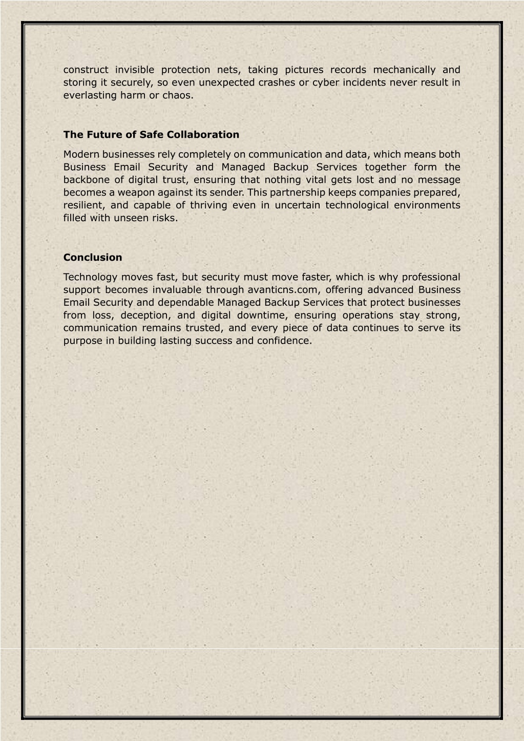 3. construct invisible protection nets, taking pictures records mechanically and storing it securely, so even unexpected crashes or cyber incidents never result in everlasting harm or chaos. The Future of Safe Collaboration Modern businesses rely completely on communication and data, which means both Business Email Security and Managed Backup Services together form the backbone of digital trust, ensuring that nothing vital gets lost and no message becomes a weapon against its sender. This partnership keeps companies prepared, resilient, and capable of thriving even in uncertain technological environments filled with unseen risks. Conclusion Technology moves fast, but security must move faster, which is why professional support becomes invaluable throughavanticns.com, offering advanced Business Email Security and dependable Managed Backup Services that protect businesses from loss, deception, and digital downtime, ensuring operations stay strong, communication remains trusted, and every piece of data continues to serve its purpose in building lasting success and confidence.