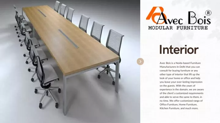 Avec Bois is a Noida-based Furniture Manufacturers In Delhi that you can consult for buying furniture or any other type of interior that lift up the look of your home or office and help you leave your ever-lasting impression on the guests. With the years of experience in the domain, we are aware of the clientu2019s customized requirements and able to serve the same to them, in no time. We offer customized range of Office Furniture, Home Furniture, Kitchen Furniture, and much more.<br><br>https://www.avecbois.com/