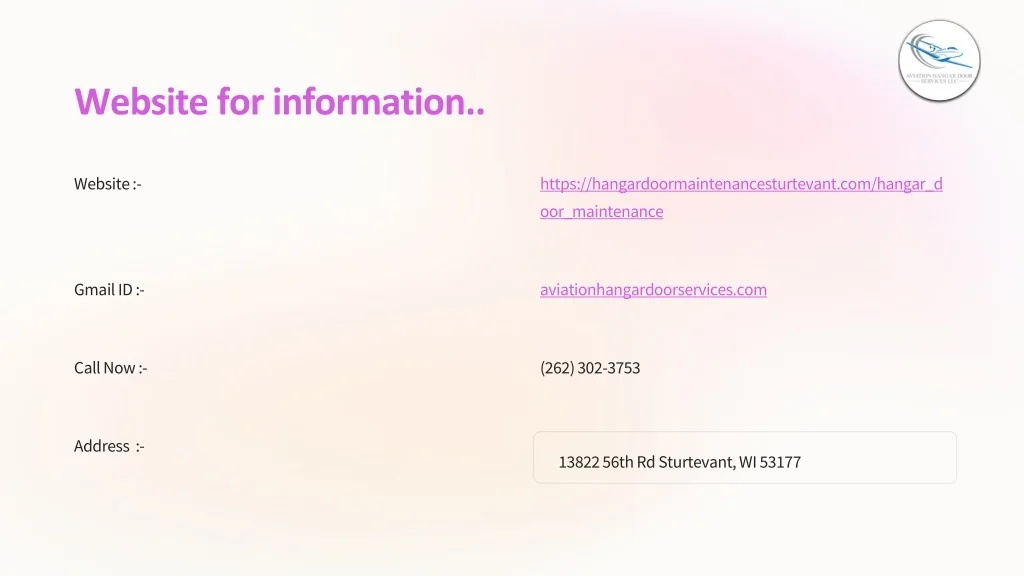 Website for information.. Website :- https://hangardoormaintenancesturtevant.com/hangar_d oor_maintenance Gmail ID :- aviationhangardoorservices.com Call Now :- (262) 302-3753 Address :- 13822 56th Rd Sturtevant, WI 53177