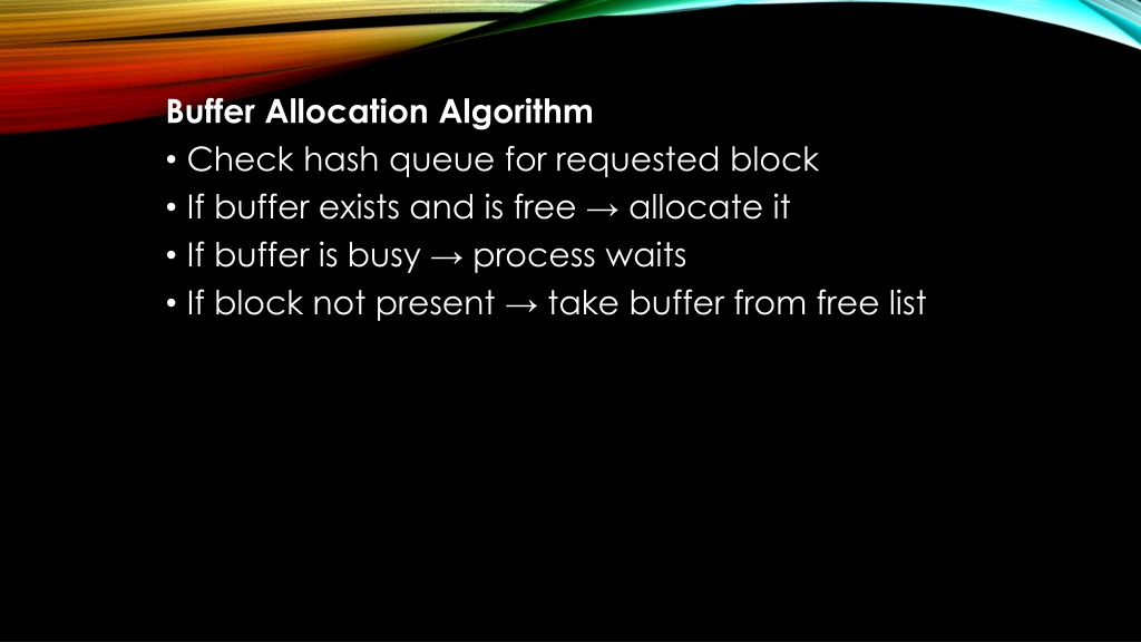 Buffer Allocation Algorithm • Check hash queue for requested block • If buffer exists and is free → allocate it • If buffer is busy → process waits • If block not present → take buffer from free list