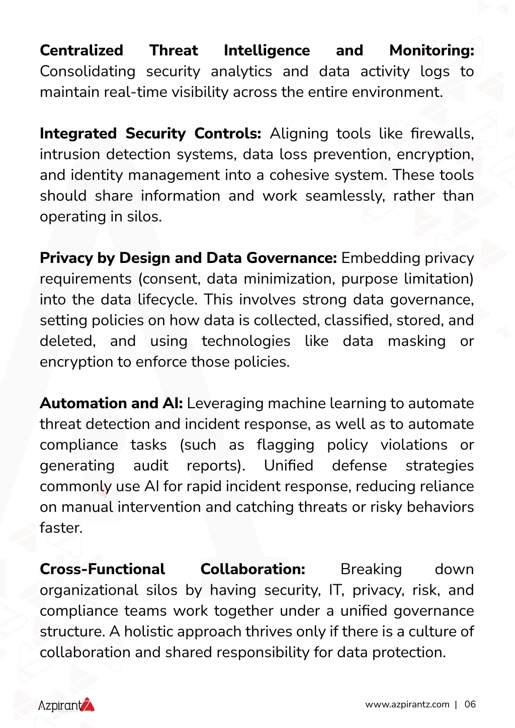 Centralized Consolidating security analytics and data activity logs to maintain real-time visibility across the entire environment. Threat Intelligence and Monitoring: Integrated Security Controls: Aligning tools like firewalls, intrusion detection systems, data loss prevention, encryption, and identity management into a cohesive system. These tools should share information and work seamlessly, rather than operating in silos. Privacy by Design and Data Governance: Embedding privacy requirements (consent, data minimization, purpose limitation) into the data lifecycle. This involves strong data governance, setting policies on how data is collected, classified, stored, and deleted, and using technologies like data masking or encryption to enforce those policies. Automation and AI: Leveraging machine learning to automate threat detection and incident response, as well as to automate compliance tasks (such as flagging policy violations or generating audit reports). commonly use AI for rapid incident response, reducing reliance on manual intervention and catching threats or risky behaviors faster. Unified defense strategies Cross-Functional organizational silos by having security, IT, privacy, risk, and compliance teams work together under a unified governance structure. A holistic approach thrives only if there is a culture of collaboration and shared responsibility for data protection. Collaboration: Breaking down www.azpirantz.com | 06