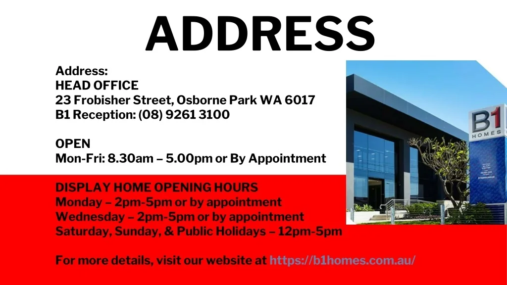 ADDRESS Address: HEAD OFFICE 23 Frobisher Street, Osborne Park WA 6017 B1 Reception: (08) 9261 3100 OPEN Mon-Fri: 8.30am – 5.00pm or By Appointment DISPLAY HOME OPENING HOURS Monday – 2pm-5pm or by appointment Wednesday – 2pm-5pm or by appointment Saturday, Sunday, & Public Holidays – 12pm-5pm For more details, visit our website at https://b1homes.com.au/