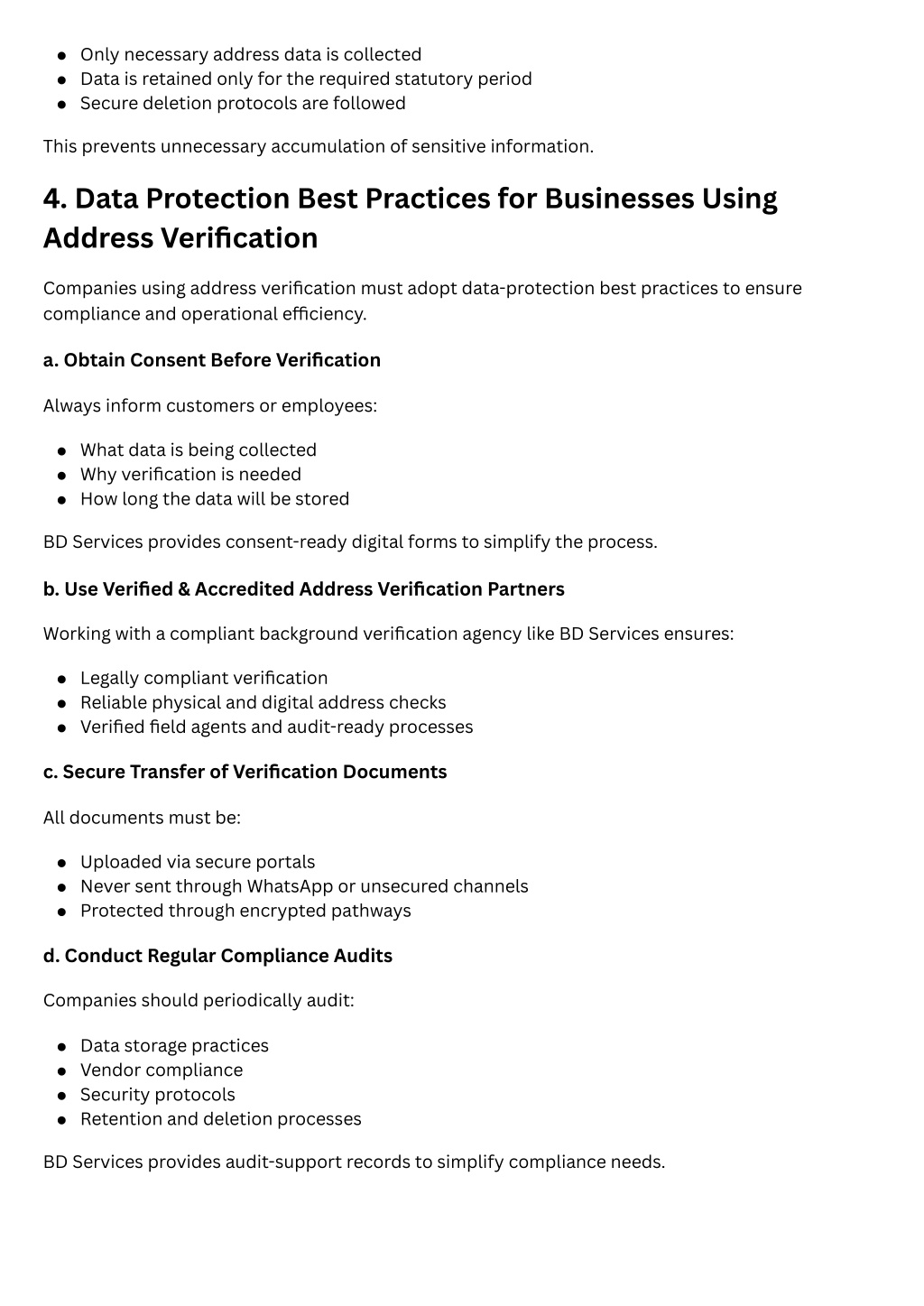 Only necessary address data is collected Data is retained only for the required statutory period Secure deletion protocols are followed This prevents unnecessary accumulation of sensitive information. 4. Data Protection Best Practices for Businesses Using Address Verification Companies using address verification must adopt data-protection best practices to ensure compliance and operational efficiency. a. Obtain Consent Before Verification Always inform customers or employees: What data is being collected Why verification is needed How long the data will be stored BD Services provides consent-ready digital forms to simplify the process. b. Use Verified & Accredited Address Verification Partners Working with a compliant background verification agency like BD Services ensures: Legally compliant verification Reliable physical and digital address checks Verified field agents and audit-ready processes c. Secure Transfer of Verification Documents All documents must be: Uploaded via secure portals Never sent through WhatsApp or unsecured channels Protected through encrypted pathways d. Conduct Regular Compliance Audits Companies should periodically audit: Data storage practices Vendor compliance Security protocols Retention and deletion processes BD Services provides audit-support records to simplify compliance needs.