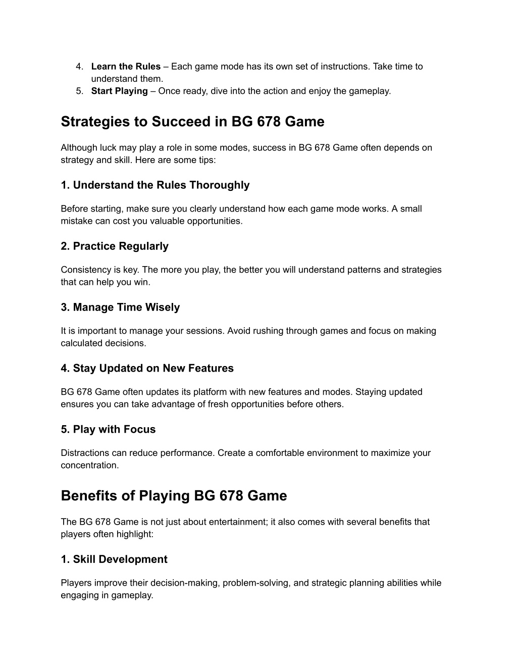 4. Learn the Rules – Each game mode has its own set of instructions. Take time to understand them. 5. Start Playing – Once ready, dive into the action and enjoy the gameplay. Strategies to Succeed in BG 678 Game Although luck may play a role in some modes, success in BG 678 Game often depends on strategy and skill. Here are some tips: 1. Understand the Rules Thoroughly Before starting, make sure you clearly understand how each game mode works. A small mistake can cost you valuable opportunities. 2. Practice Regularly Consistency is key. The more you play, the better you will understand patterns and strategies that can help you win. 3. Manage Time Wisely It is important to manage your sessions. Avoid rushing through games and focus on making calculated decisions. 4. Stay Updated on New Features BG 678 Game often updates its platform with new features and modes. Staying updated ensures you can take advantage of fresh opportunities before others. 5. Play with Focus Distractions can reduce performance. Create a comfortable environment to maximize your concentration. Benefits of Playing BG 678 Game The BG 678 Game is not just about entertainment; it also comes with several benefits that players often highlight: 1. Skill Development Players improve their decision-making, problem-solving, and strategic planning abilities while engaging in gameplay.