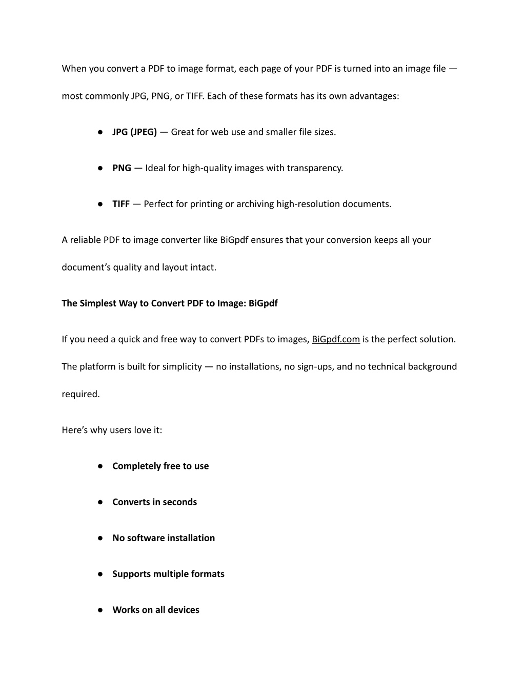 When you convert a PDF to image format, each page of your PDF is turned into an image file — most commonly JPG, PNG, or TIFF. Each of these formats has its own advantages: ● JPG (JPEG) — Great for web use and smaller file sizes. ● PNG — Ideal for high-quality images with transparency. ● TIFF — Perfect for printing or archiving high-resolution documents. A reliable PDF to image converter like BiGpdf ensures that your conversion keeps all your document’s quality and layout intact. The Simplest Way to Convert PDF to Image: BiGpdf If you need a quick and free way to convert PDFs to images, BiGpdf.com is the perfect solution. The platform is built for simplicity — no installations, no sign-ups, and no technical background required. Here’s why users love it: ● Completely free to use ● Converts in seconds ● No software installation ● Supports multiple formats ● Works on all devices