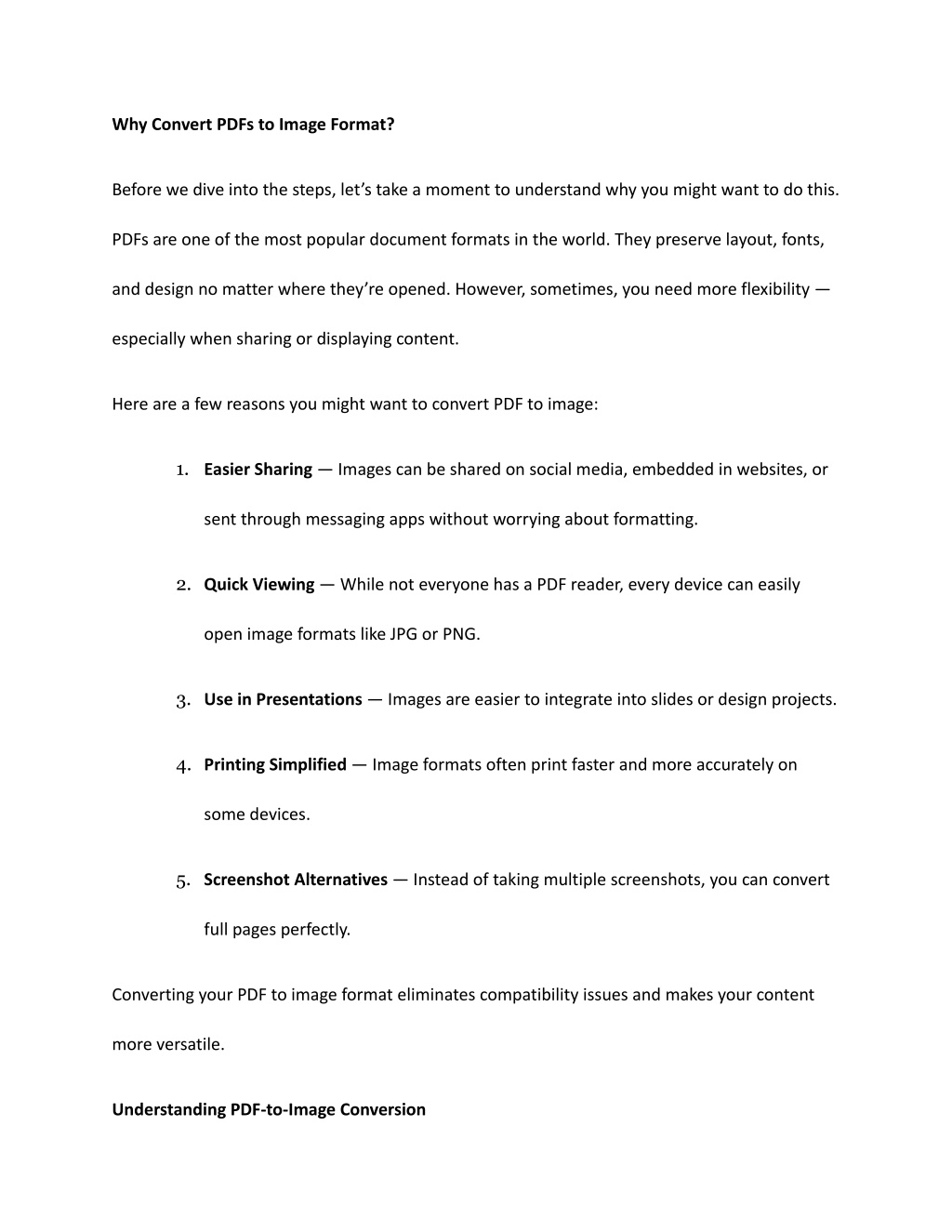 Why Convert PDFs to Image Format? Before we dive into the steps, let’s take a moment to understand why you might want to do this. PDFs are one of the most popular document formats in the world. They preserve layout, fonts, and design no matter where they’re opened. However, sometimes, you need more flexibility — especially when sharing or displaying content. Here are a few reasons you might want to convert PDF to image: 1.Easier Sharing — Images can be shared on social media, embedded in websites, or sent through messaging apps without worrying about formatting. 2.Quick Viewing — While not everyone has a PDF reader, every device can easily open image formats like JPG or PNG. 3.Use in Presentations — Images are easier to integrate into slides or design projects. 4.Printing Simplified — Image formats often print faster and more accurately on some devices. 5.Screenshot Alternatives — Instead of taking multiple screenshots, you can convert full pages perfectly. Converting your PDF to image format eliminates compatibility issues and makes your content more versatile. Understanding PDF-to-Image Conversion