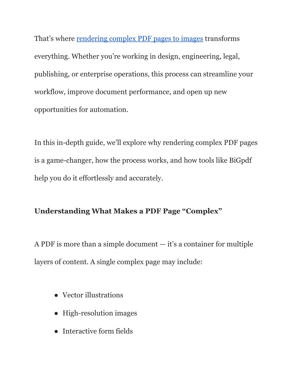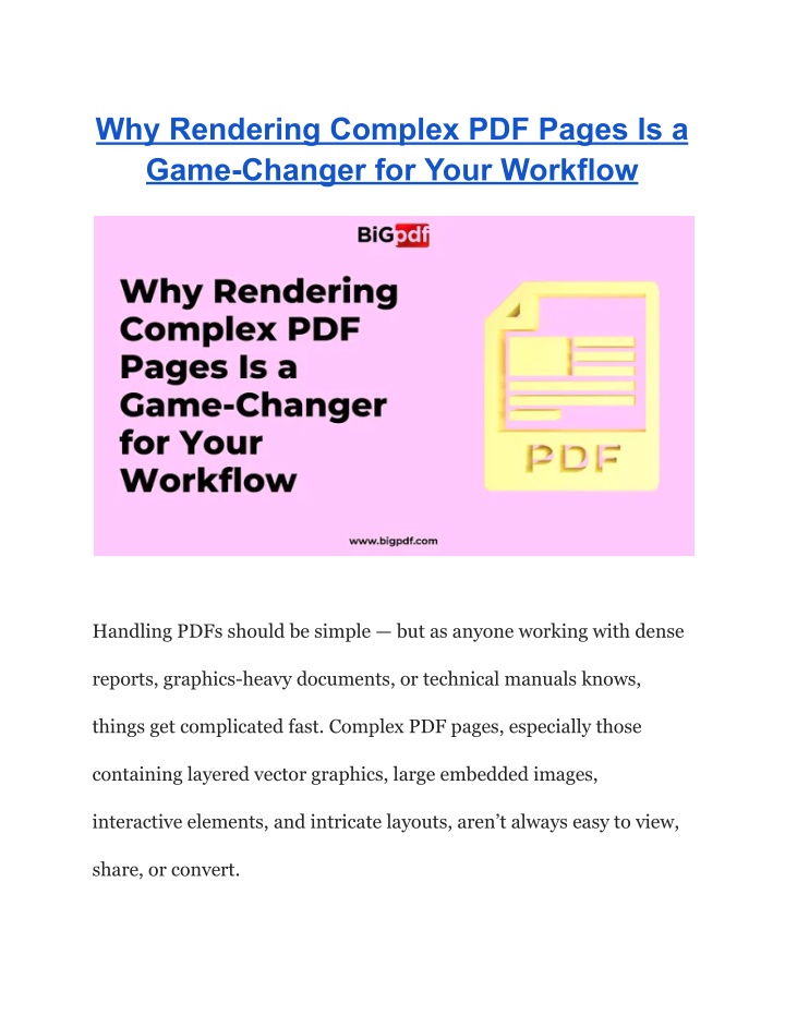 2. That’s where rendering complex PDF pages to images transforms everything. Whether you’re working in design, engineering, legal, publishing, or enterprise operations, this process can streamline your workflow, improve document performance, and open up new opportunities for automation. In this in-depth guide, we’ll explore why rendering complex PDF pages is a game-changer, how the process works, and how tools like BiGpdf help you do it effortlessly and accurately. Understanding What Makes a PDF Page “Complex” A PDF is more than a simple document — it’s a container for multiple layers of content. A single complex page may include: ● Vector illustrations ● High-resolution images ● Interactive form fields