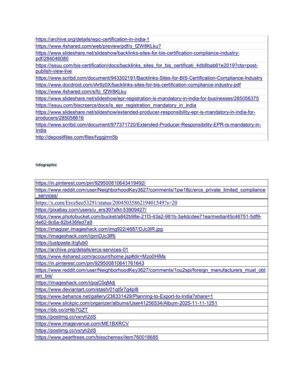 https://archive.org/details/wpc-certification-in-india-1 https://www.4shared.com/web/preview/pdf/o_fZW8KLku? https://www.slideshare.net/slideshow/backlinks-sites-for-bis-certification-compliance-industry- pdf/284046080 https://issuu.com/bis-certification/docs/backlinks_sites_for_bis_certificati_4db8bab61e2019?cta=post- publish-view-live https://www.scribd.com/document/943302191/Backlinks-Sites-for-BIS-Certification-Compliance-Industry https://www.docdroid.com/iAr9z0X/backlinks-sites-for-bis-certification-compliance-industry-pdf https://www.4shared.com/s/fo_fZW8KLku https://www.slideshare.net/slideshow/epr-registration-is-mandatory-in-india-for-businesses/285056375 https://issuu.com/biscrsercs/docs/is_epr_registration_mandatory_in_india https://www.slideshare.net/slideshow/extended-producer-responsibility-epr-is-mandatory-in-india-for- producers/285056616 https://www.scribd.com/document/977371720/Extended-Producer-Responsibility-EPR-is-mandatory-in- India http://depositfiles.com/files/fyggjmn5b Infographic https://in.pinterest.com/pin/929500810643419492/ https://www.reddit.com/user/NeighborhoodKey3627/comments/1pw18jc/ercs_private_limited_compliance _services/ https://x.com/ErcsSeo53291/status/2004503586219401549?s=20 https://pixabay.com/users/u_ers397sfkt-53909427/ https://www.photobucket.com/bucket/a842b98e-21f3-43a2-981b-3a4dcdee71ea/media/45c46751-5df9- 4e62-8c6a-82b436fed7a9 https://imagizer.imageshack.com/img922/4687/DJc3lR.jpg https://imageshack.com/i/pmDJc3lRj https://justpaste.it/gfub0 https://archive.org/details/ercs-services-01 https://www.4shared.com/account/home.jsp#dir=Mzo0HiMs https://in.pinterest.com/pin/929500810641761643 https://www.reddit.com/user/NeighborhoodKey3627/comments/1ou2spi/foreign_manufacturers_must_obt ain_bis/ https://imageshack.com/i/pojC0qMdj https://www.deviantart.com/stash/01qt5r7g4pl8 https://www.behance.net/gallery/238331429/Planning-to-Export-to-India?share=1 https://www.slickpic.com/organizer/albums/User41256534/Album-2025-11-11-1251 https://ibb.co/zHtb7GZT https://postimg.cc/vxryh2dS https://www.imagevenue.com/ME1BXRCV https://postimg.cc/vxryh2dS https://www.pearltrees.com/bisschemex/item760018685