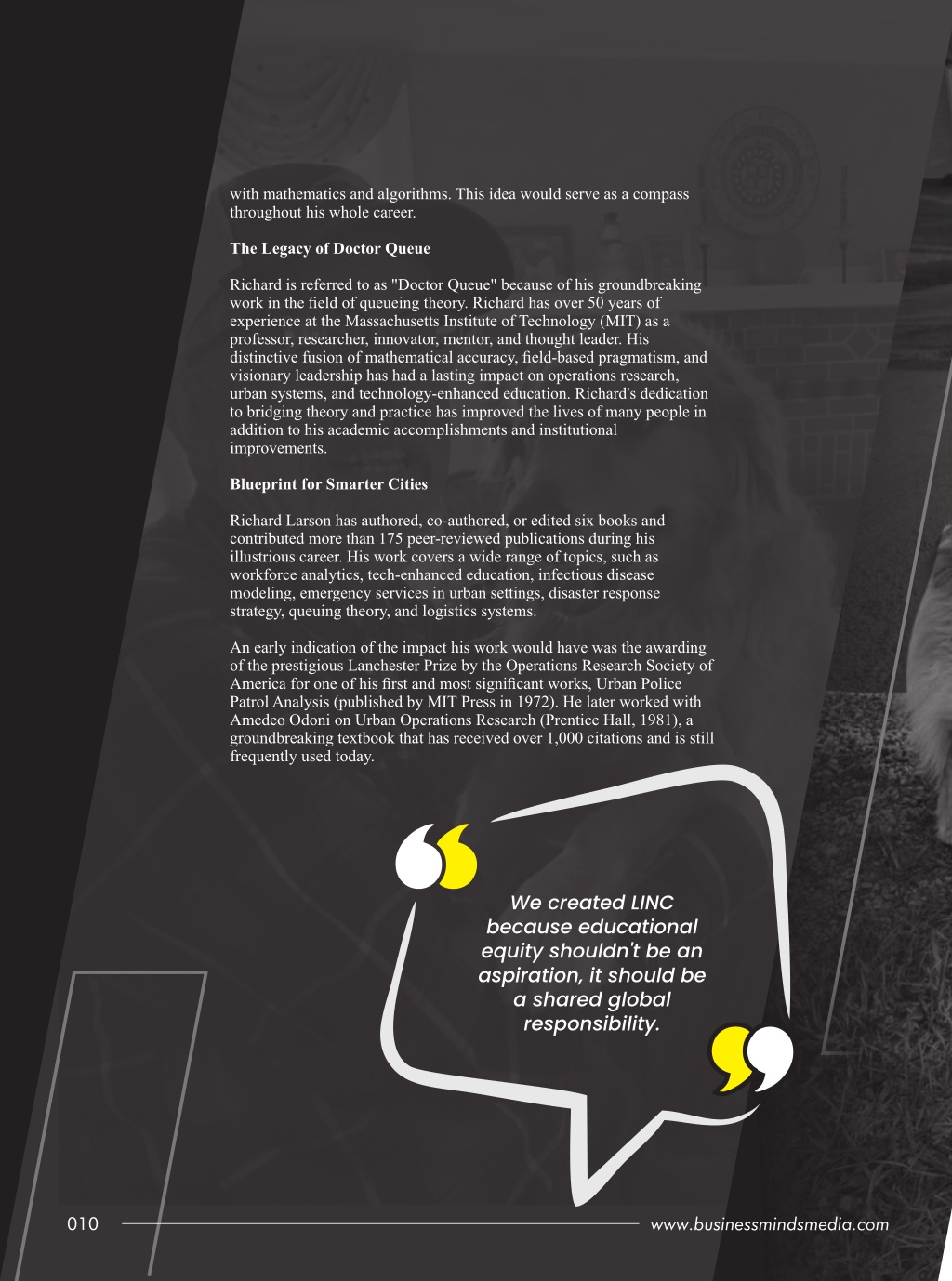 with mathematics and algorithms. This idea would serve as a compass throughout his whole career. The Legacy of Doctor Queue Richard is referred to as "Doctor Queue" because of his groundbreaking work in the field of queueing theory. Richard has over 50 years of experience at the Massachusetts Institute of Technology (MIT) as a professor, researcher, innovator, mentor, and thought leader. His distinctive fusion of mathematical accuracy, field-based pragmatism, and visionary leadership has had a lasting impact on operations research, urban systems, and technology-enhanced education. Richard's dedication to bridging theory and practice has improved the lives of many people in addition to his academic accomplishments and institutional improvements. Blueprint for Smarter Cities Richard Larson has authored, co-authored, or edited six books and contributed more than 175 peer-reviewed publications during his illustrious career. His work covers a wide range of topics, such as workforce analytics, tech-enhanced education, infectious disease modeling, emergency services in urban settings, disaster response strategy, queuing theory, and logistics systems. An early indication of the impact his work would have was the awarding of the prestigious Lanchester Prize by the Operations Research Society of America for one of his first and most significant works, Urban Police Patrol Analysis (published by MIT Press in 1972). He later worked with Amedeo Odoni on Urban Operations Research (Prentice Hall, 1981), a groundbreaking textbook that has received over 1,000 citations and is still frequently used today. We created LINC because educational equity shouldn't be an aspiration, it should be a shared global responsibility. 010 011 www.businessmindsmedia.com www.businessmindsmedia.com