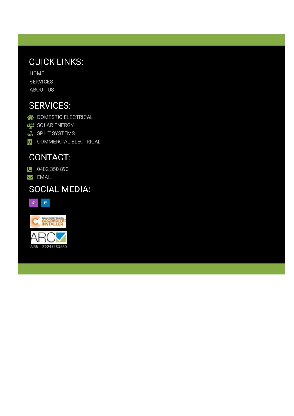 QUICK LINKS: HOME SERVICES ABOUT US SERVICES: DOMESTIC ELECTRICAL SOLAR ENERGY SPLIT SYSTEMS COMMERCIAL ELECTRICAL CONTACT: 0402 350 893 EMAIL SOCIAL MEDIA: