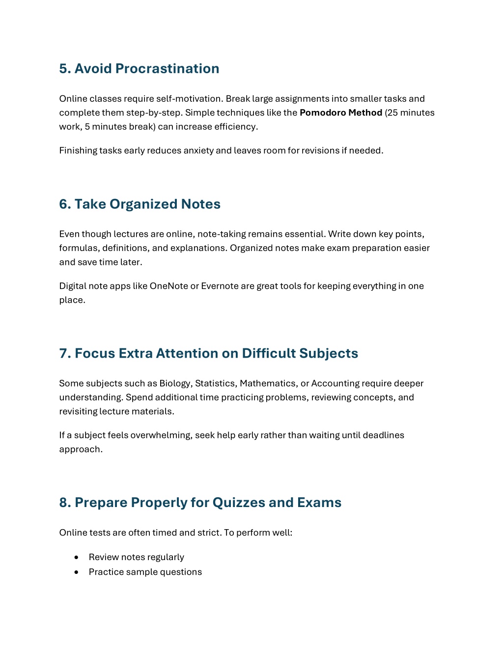 3. 5. Avoid Procrastination Online classes require self-motivation. Break large assignments into smaller tasks and complete them step-by-step. Simple techniques like the Pomodoro Method (25 minutes work, 5 minutes break) can increase efficiency. Finishing tasks early reduces anxiety and leaves room for revisions if needed. 6. Take Organized Notes Even though lectures are online, note-taking remains essential. Write down key points, formulas, definitions, and explanations. Organized notes make exam preparation easier and save time later. Digital note apps like OneNote or Evernote are great tools for keeping everything in one place. 7. Focus Extra Attention on Difficult Subjects Some subjects such as Biology, Statistics, Mathematics, or Accounting require deeper understanding. Spend additional time practicing problems, reviewing concepts, and revisiting lecture materials. If a subject feels overwhelming, seek help early rather than waiting until deadlines approach. 8. Prepare Properly for Quizzes and Exams Online tests are often timed and strict. To perform well: •Review notes regularly •Practice sample questions
