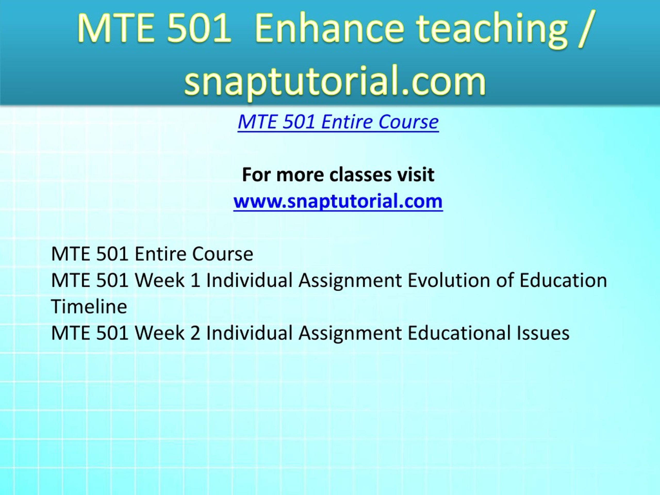MTE 501 Enhance teaching / snaptutorial.com MTE 501 Entire Course For more classes visit www.snaptutorial.com MTE 501 Entire Course MTE 501 Week 1 Individual Assignment Evolution of Education Timeline MTE 501 Week 2 Individual Assignment Educational Issues
