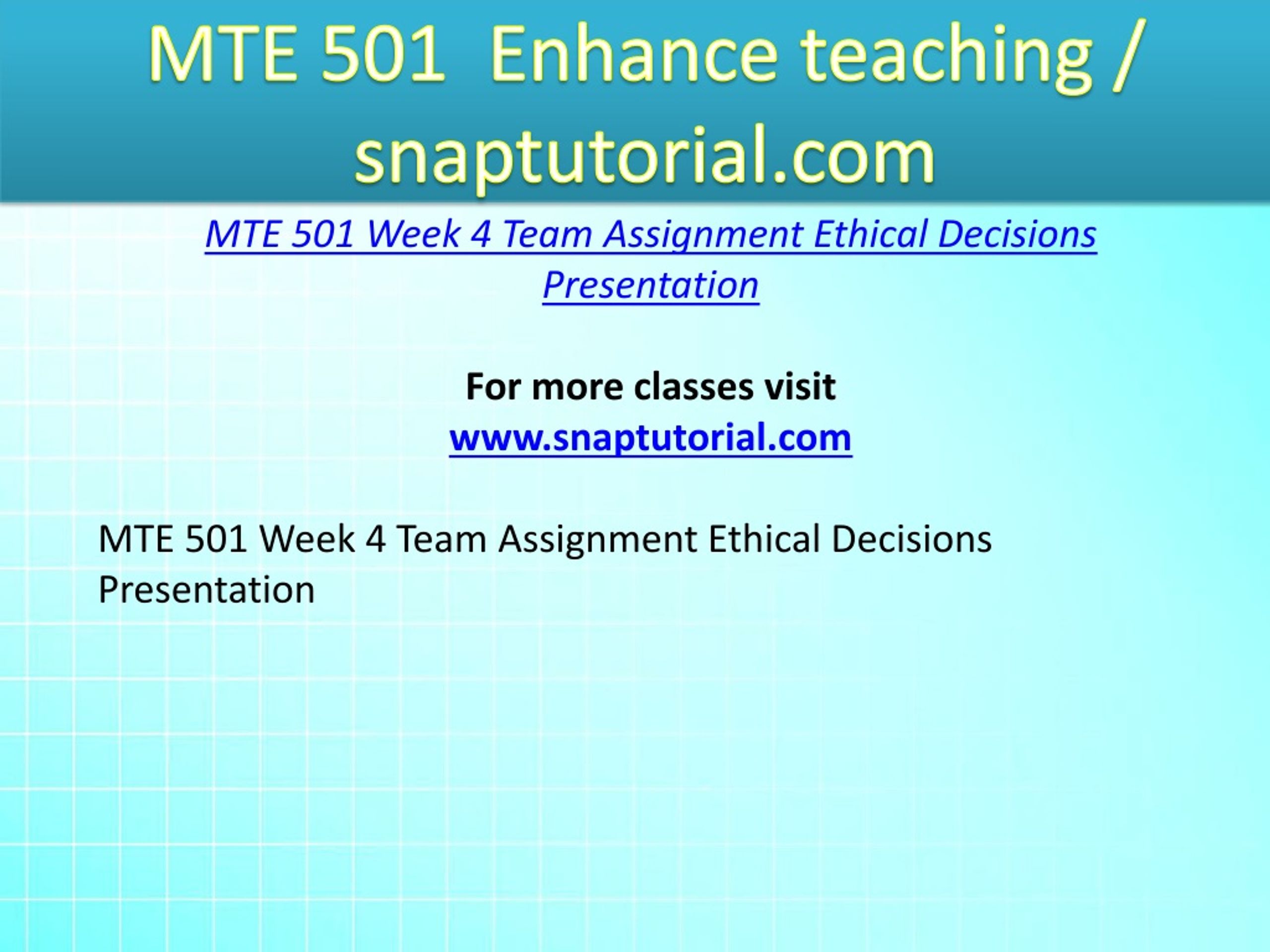 MTE 501 Enhance teaching / snaptutorial.com MTE 501 Week 4 Team Assignment Ethical Decisions Presentation For more classes visit www.snaptutorial.com MTE 501 Week 4 Team Assignment Ethical Decisions Presentation