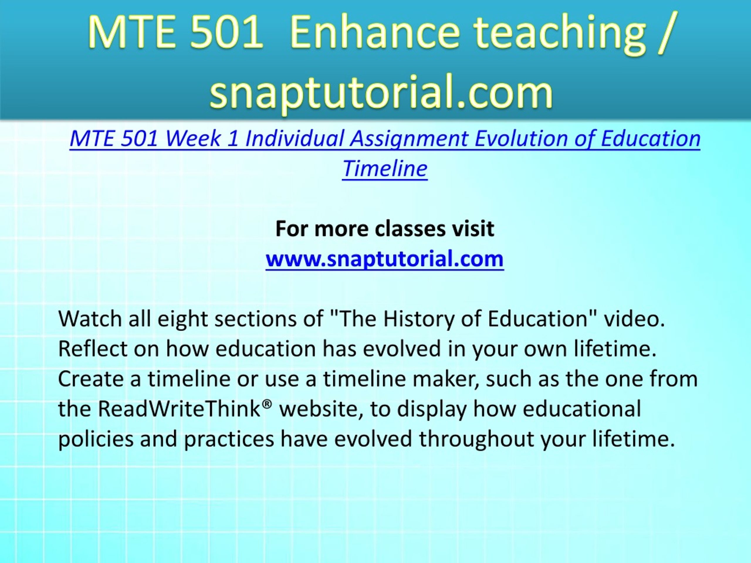 MTE 501 Enhance teaching / snaptutorial.com MTE 501 Week 1 Individual Assignment Evolution of Education Timeline For more classes visit www.snaptutorial.com Watch all eight sections of "The History of Education" video. Reflect on how education has evolved in your own lifetime. Create a timeline or use a timeline maker, such as the one from the ReadWriteThink® website, to display how educational policies and practices have evolved throughout your lifetime.