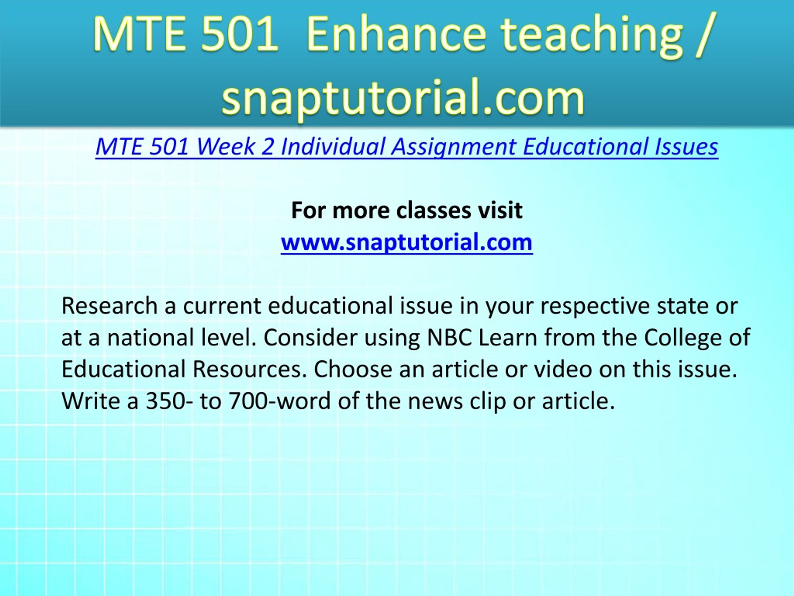 MTE 501 Enhance teaching / snaptutorial.com MTE 501 Week 2 Individual Assignment Educational Issues For more classes visit www.snaptutorial.com Research a current educational issue in your respective state or at a national level. Consider using NBC Learn from the College of Educational Resources. Choose an article or video on this issue. Write a 350- to 700-word of the news clip or article.