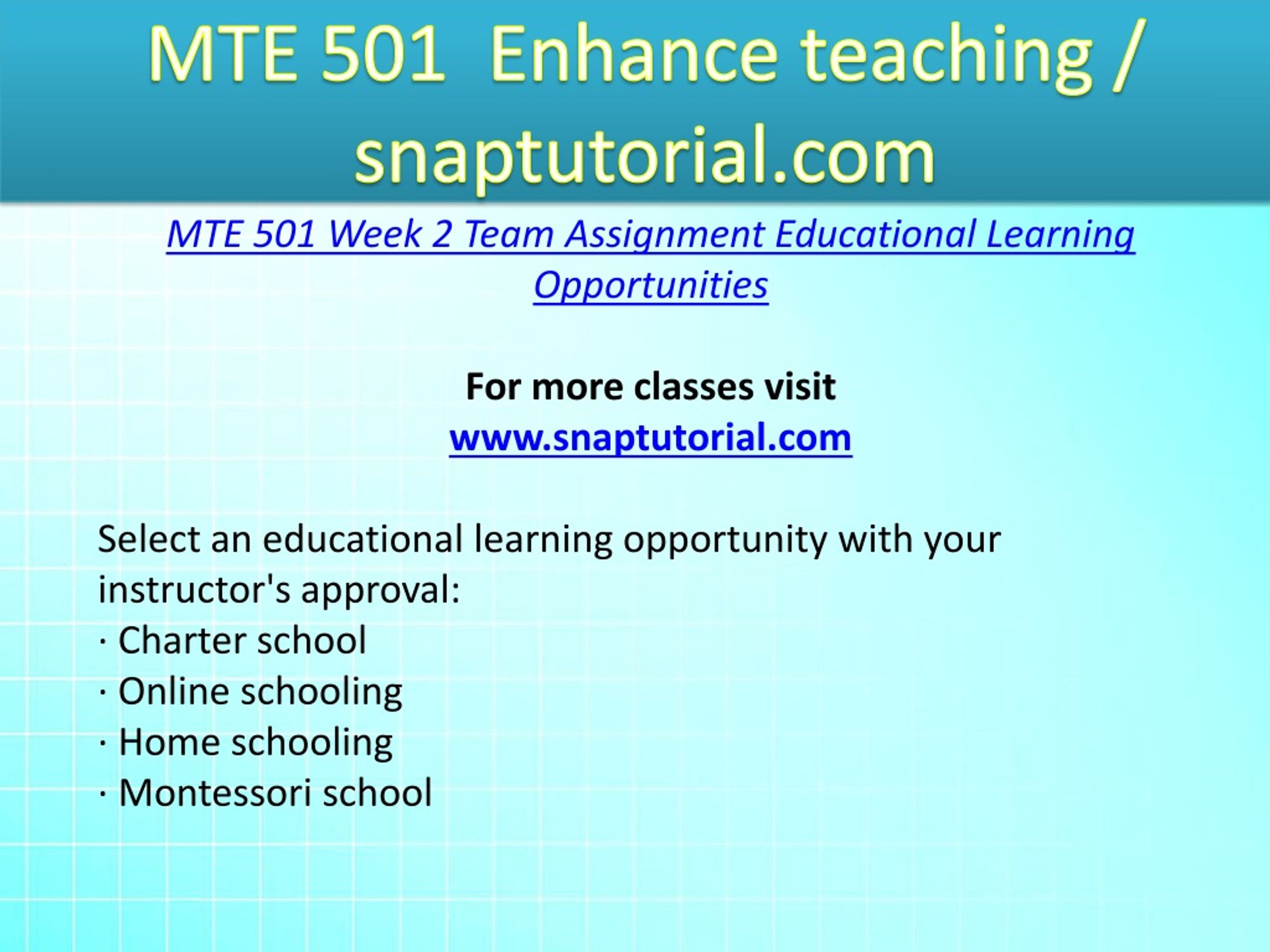 MTE 501 Enhance teaching / snaptutorial.com MTE 501 Week 2 Team Assignment Educational Learning Opportunities For more classes visit www.snaptutorial.com Select an educational learning opportunity with your instructor's approval: · Charter school · Online schooling · Home schooling · Montessori school