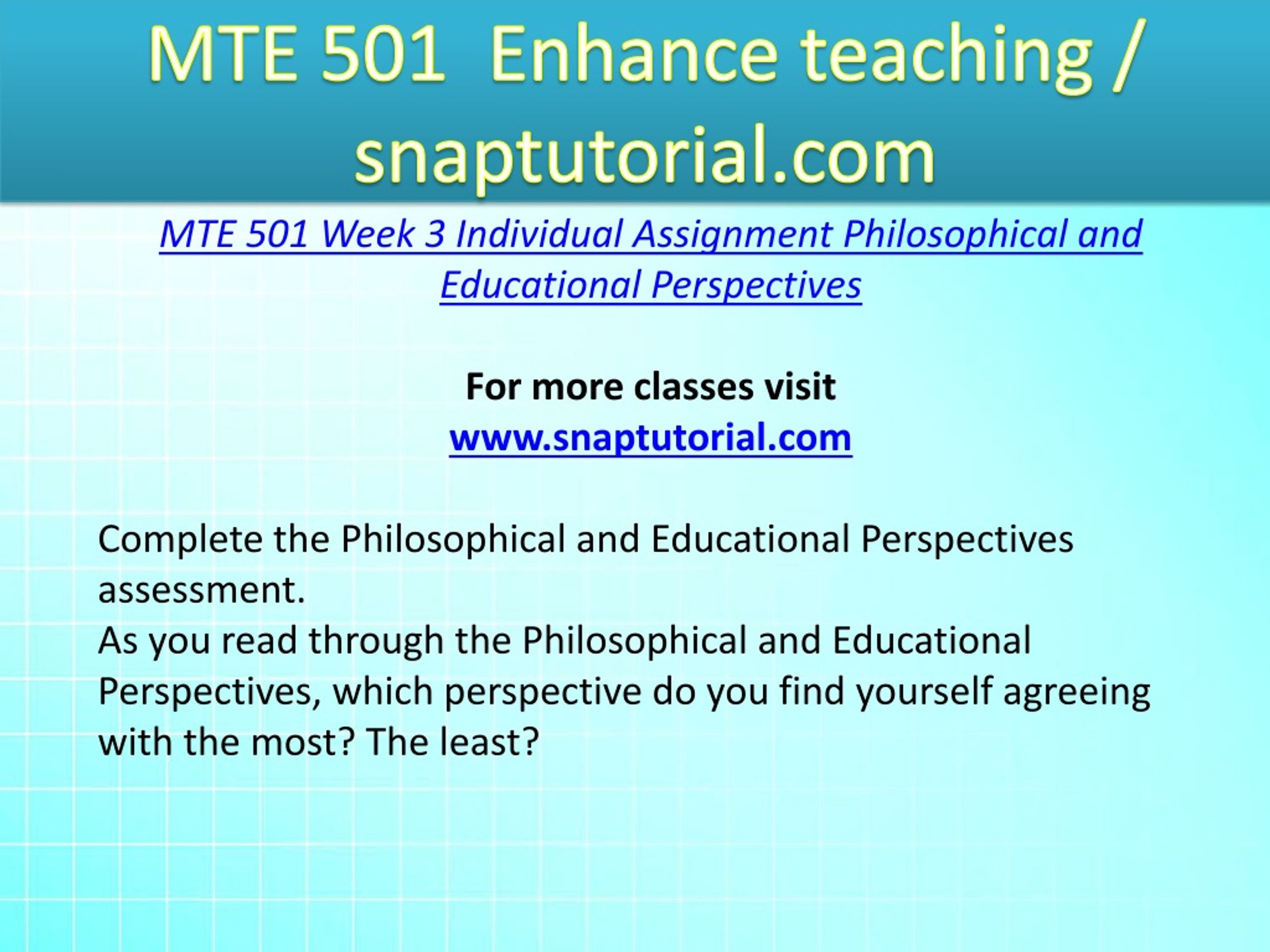 MTE 501 Enhance teaching / snaptutorial.com MTE 501 Week 3 Individual Assignment Philosophical and Educational Perspectives For more classes visit www.snaptutorial.com Complete the Philosophical and Educational Perspectives assessment. As you read through the Philosophical and Educational Perspectives, which perspective do you find yourself agreeing with the most? The least?
