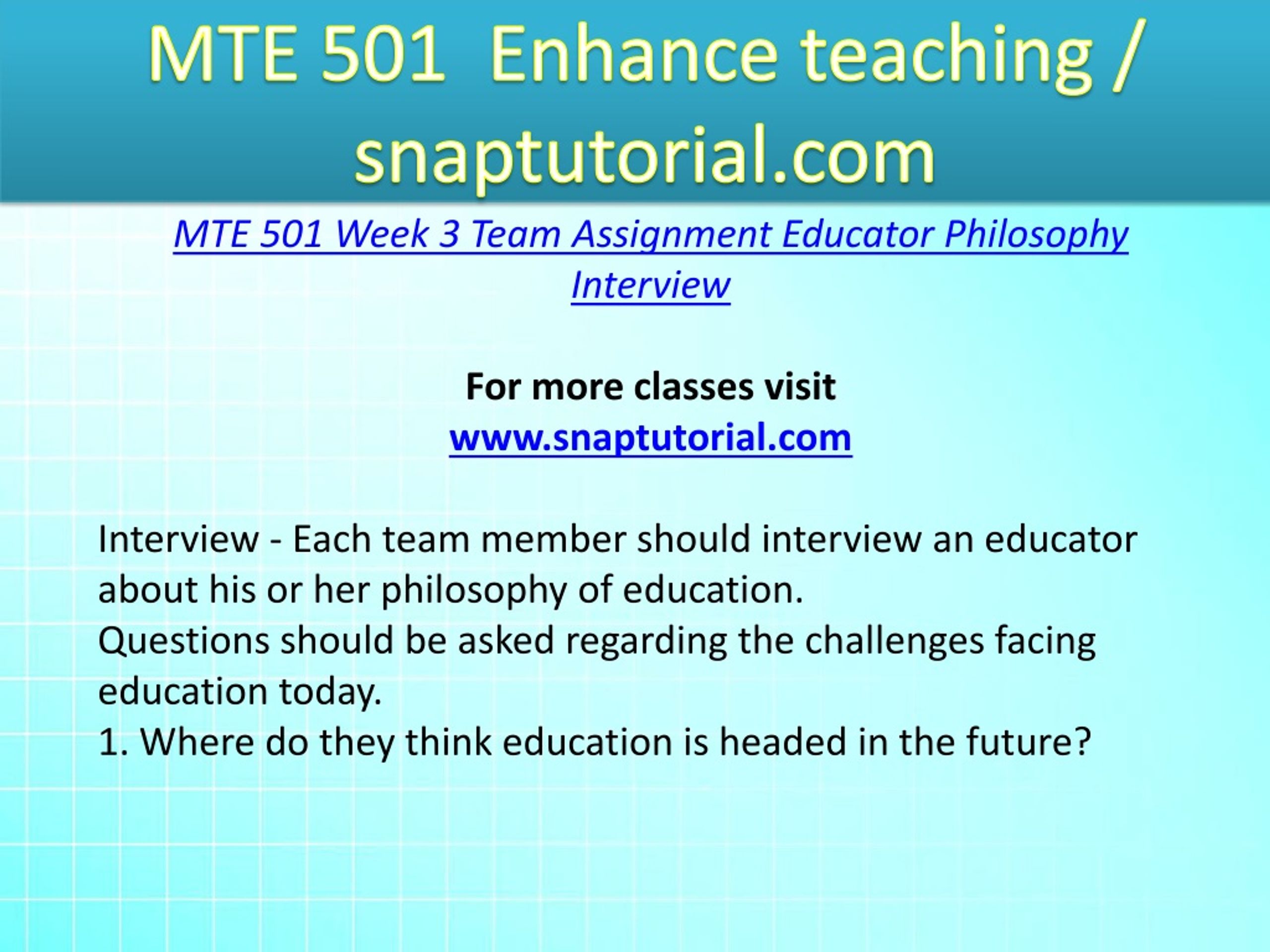 MTE 501 Enhance teaching / snaptutorial.com MTE 501 Week 3 Team Assignment Educator Philosophy Interview For more classes visit www.snaptutorial.com Interview - Each team member should interview an educator about his or her philosophy of education. Questions should be asked regarding the challenges facing education today. 1. Where do they think education is headed in the future?