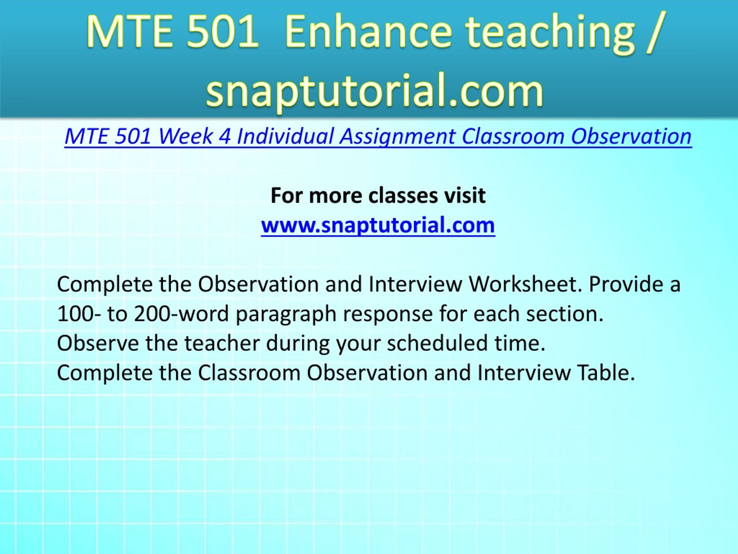 MTE 501 Enhance teaching / snaptutorial.com MTE 501 Week 4 Individual Assignment Classroom Observation For more classes visit www.snaptutorial.com Complete the Observation and Interview Worksheet. Provide a 100- to 200-word paragraph response for each section. Observe the teacher during your scheduled time. Complete the Classroom Observation and Interview Table.