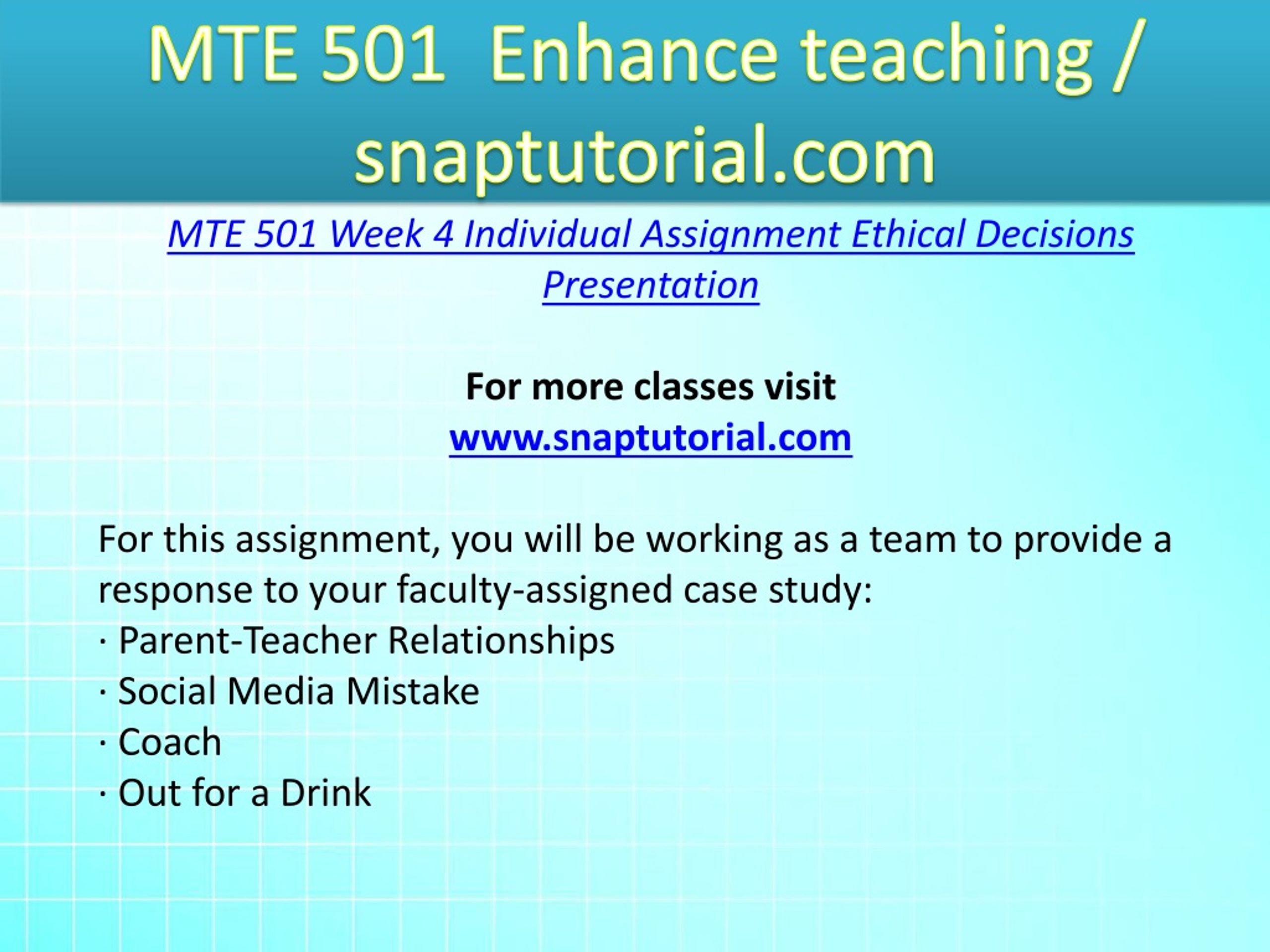 MTE 501 Enhance teaching / snaptutorial.com MTE 501 Week 4 Individual Assignment Ethical Decisions Presentation For more classes visit www.snaptutorial.com For this assignment, you will be working as a team to provide a response to your faculty-assigned case study: · Parent-Teacher Relationships · Social Media Mistake · Coach · Out for a Drink
