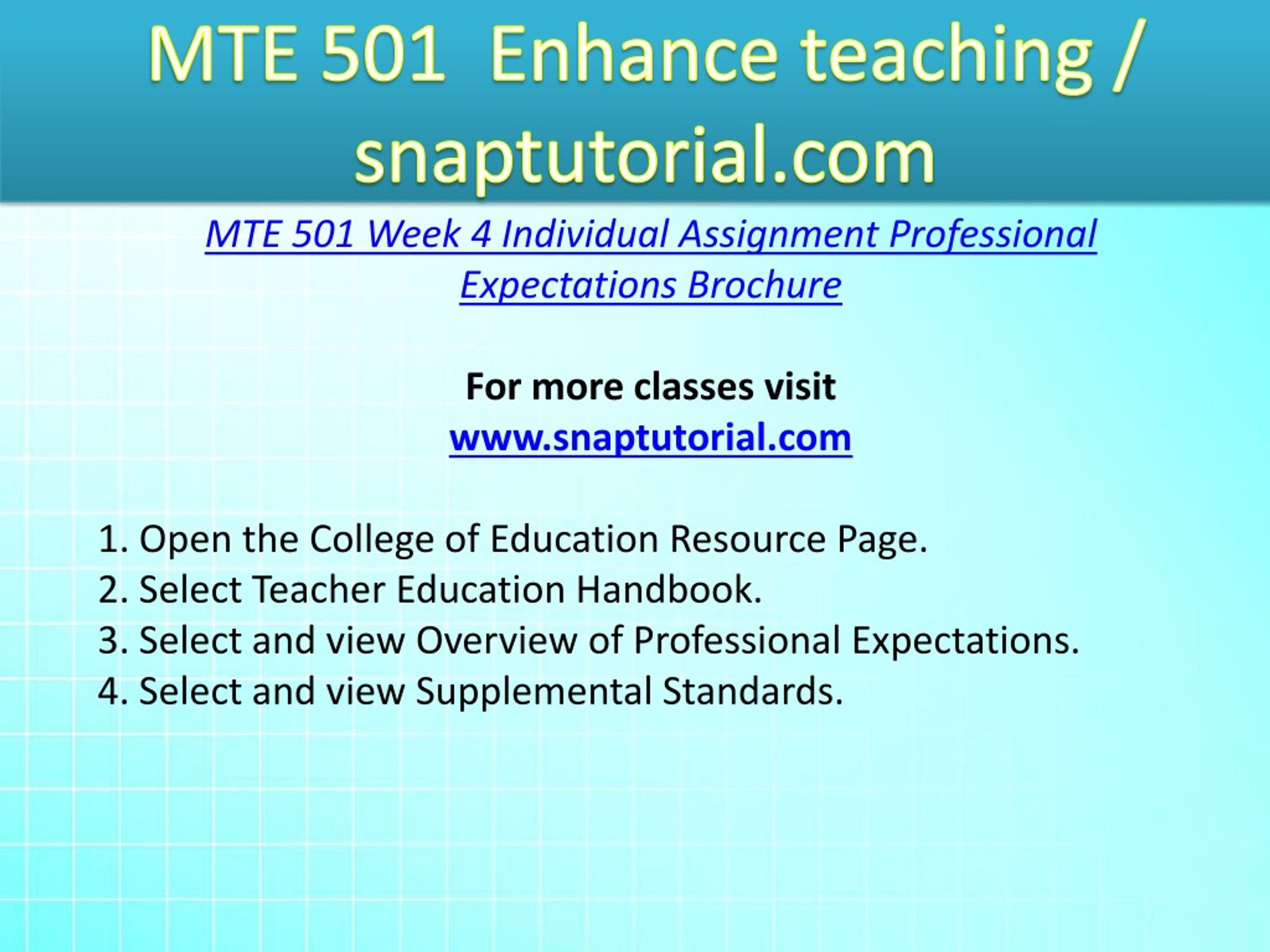 MTE 501 Enhance teaching / snaptutorial.com MTE 501 Week 4 Individual Assignment Professional Expectations Brochure For more classes visit www.snaptutorial.com 1. Open the College of Education Resource Page. 2. Select Teacher Education Handbook. 3. Select and view Overview of Professional Expectations. 4. Select and view Supplemental Standards.