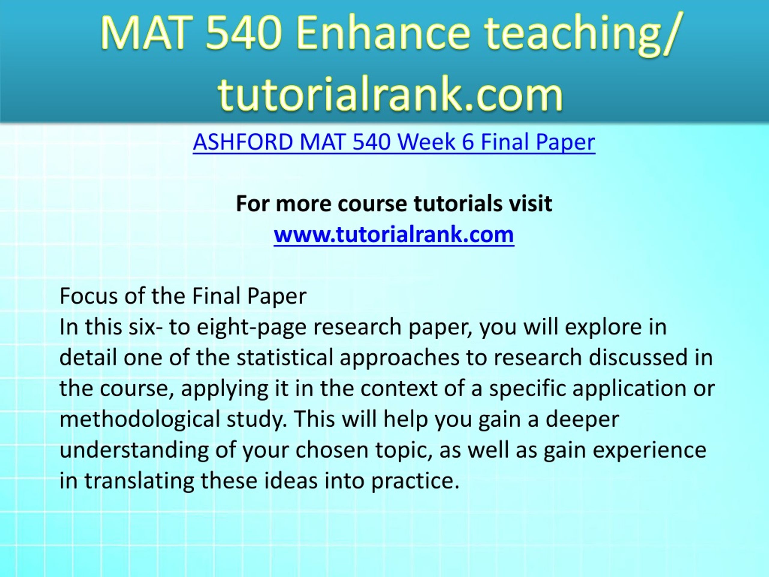 MAT 540 Enhance teaching/ tutorialrank.com ASHFORD MAT 540 Week 6 Final Paper For more course tutorials visit www.tutorialrank.com Focus of the Final Paper In this six- to eight-page research paper, you will explore in detail one of the statistical approaches to research discussed in the course, applying it in the context of a specific application or methodological study. This will help you gain a deeper understanding of your chosen topic, as well as gain experience in translating these ideas into practice.