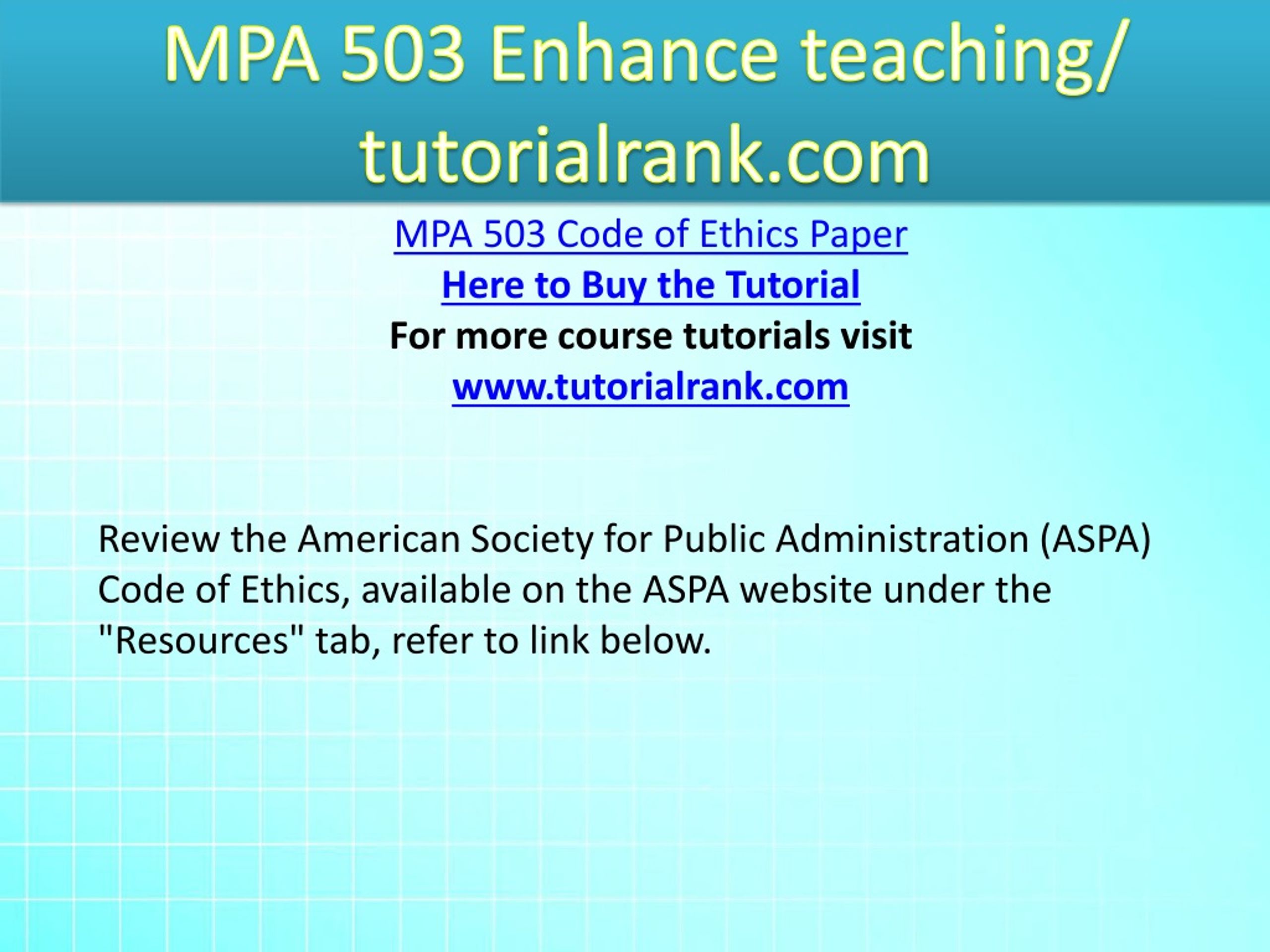 MPA 503 Enhance teaching/ tutorialrank.com MPA 503 Code of Ethics Paper Here to Buy the Tutorial For more course tutorials visit www.tutorialrank.com Review the American Society for Public Administration (ASPA) Code of Ethics, available on the ASPA website under the "Resources" tab, refer to link below.