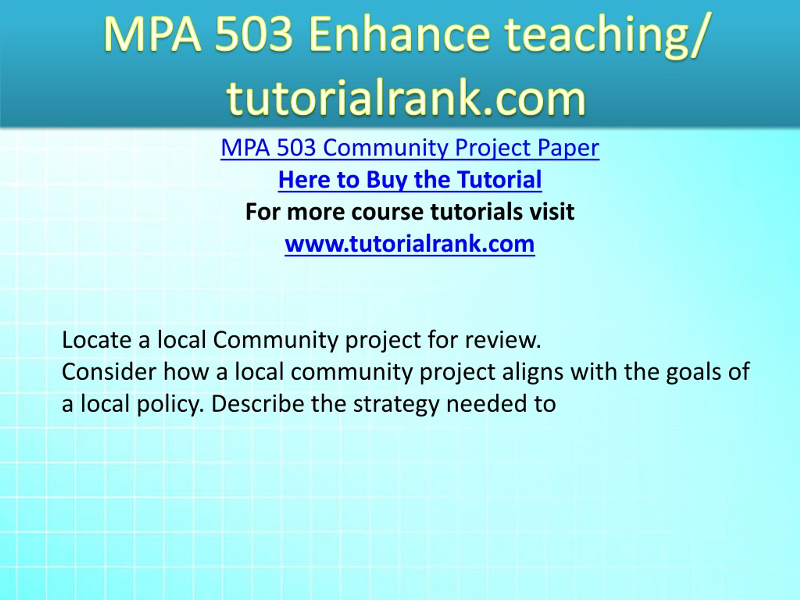 MPA 503 Enhance teaching/ tutorialrank.com MPA 503 Community Project Paper Here to Buy the Tutorial For more course tutorials visit www.tutorialrank.com Locate a local Community project for review. Consider how a local community project aligns with the goals of a local policy. Describe the strategy needed to