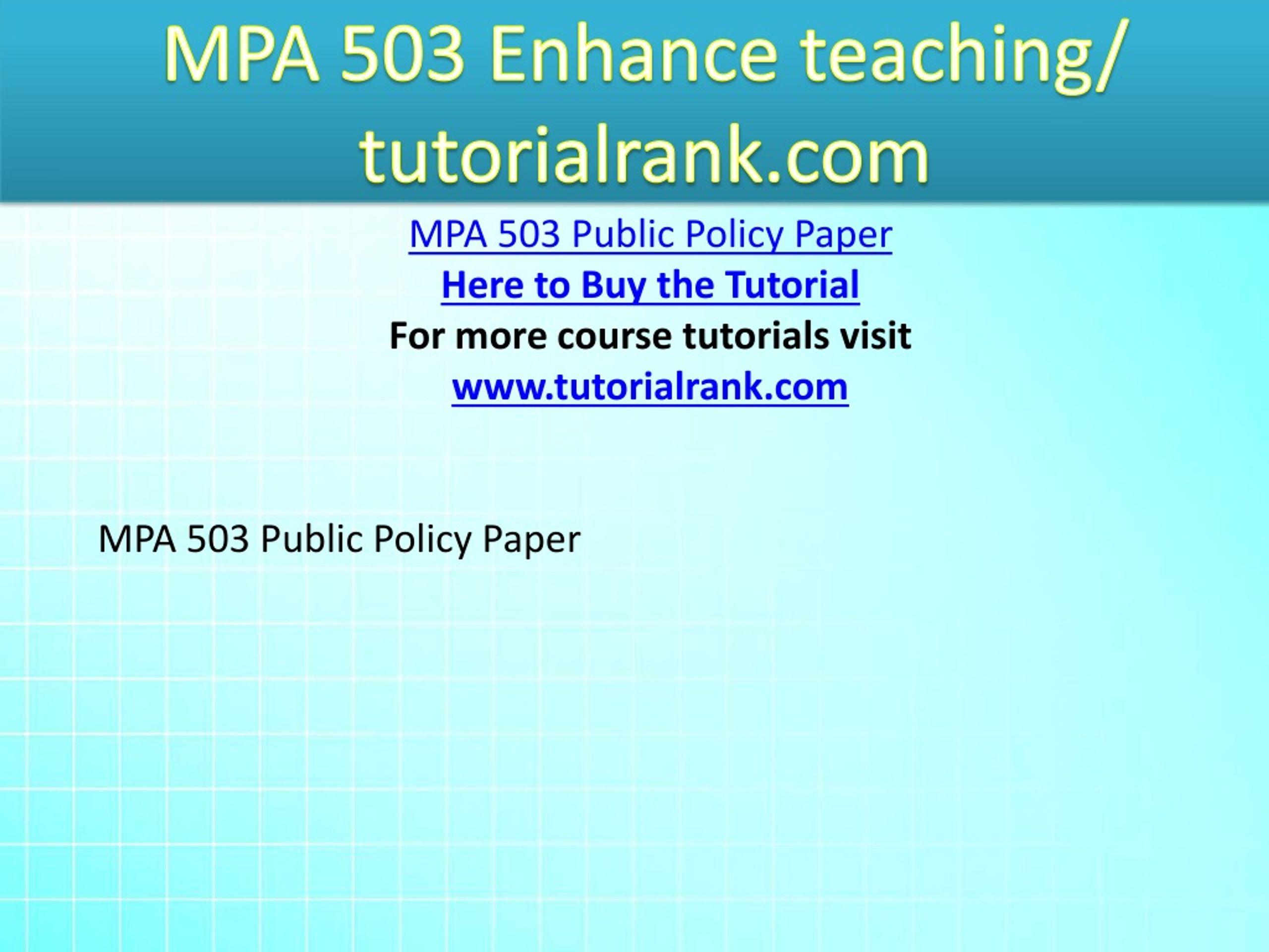 MPA 503 Enhance teaching/ tutorialrank.com MPA 503 Public Policy Paper Here to Buy the Tutorial For more course tutorials visit www.tutorialrank.com MPA 503 Public Policy Paper