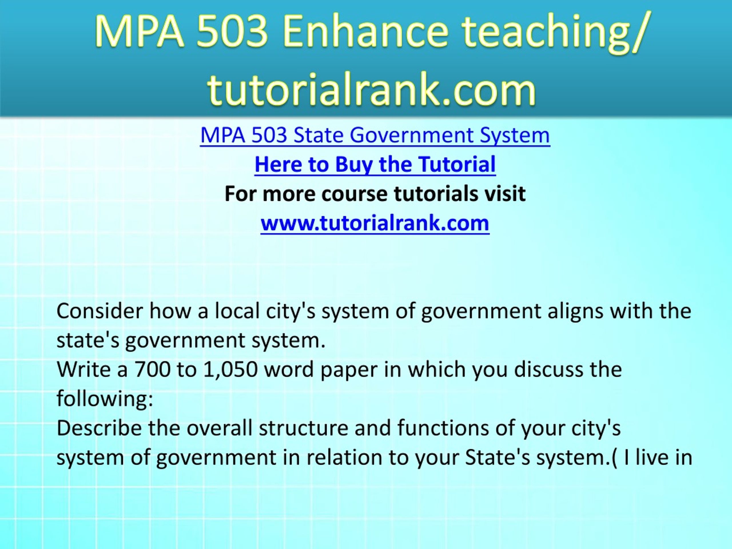 MPA 503 Enhance teaching/ tutorialrank.com MPA 503 State Government System Here to Buy the Tutorial For more course tutorials visit www.tutorialrank.com Consider how a local city's system of government aligns with the state's government system. Write a 700 to 1,050 word paper in which you discuss the following: Describe the overall structure and functions of your city's system of government in relation to your State's system.( I live in