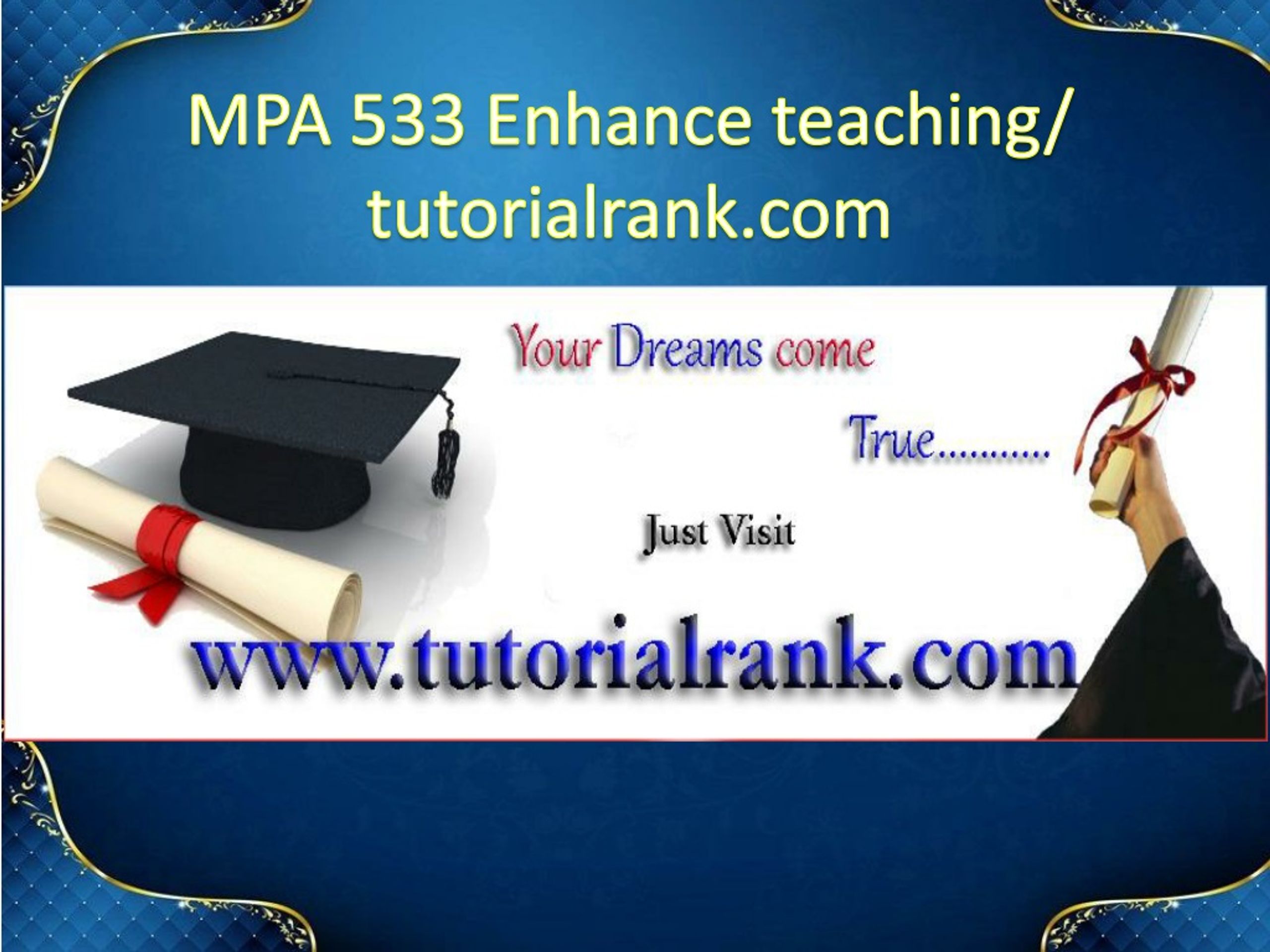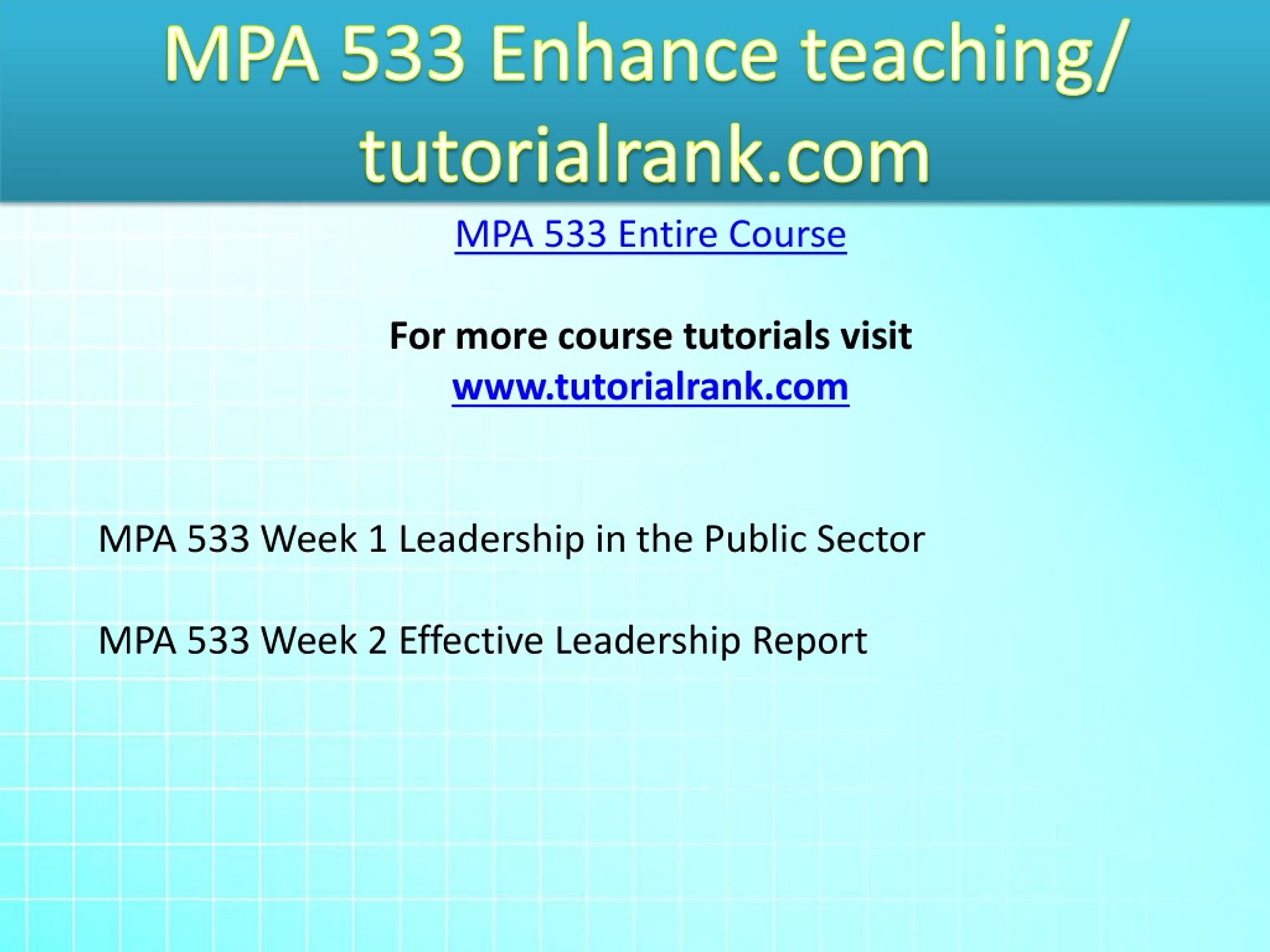 MPA 533 Enhance teaching/ tutorialrank.com MPA 533 Entire Course For more course tutorials visit www.tutorialrank.com MPA 533 Week 1 Leadership in the Public Sector MPA 533 Week 2 Effective Leadership Report
