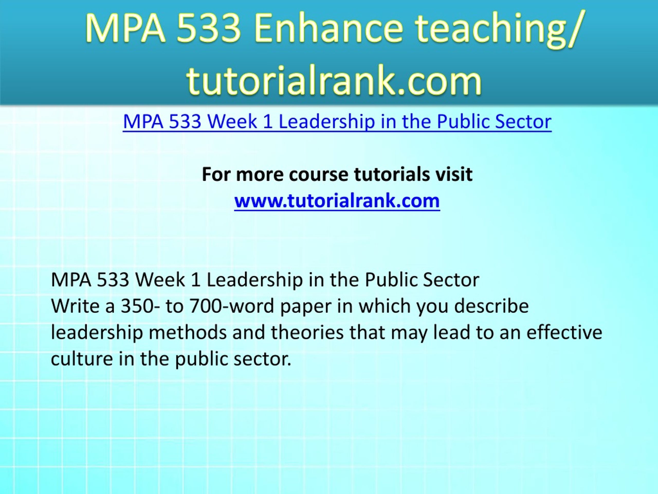 MPA 533 Enhance teaching/ tutorialrank.com MPA 533 Week 1 Leadership in the Public Sector For more course tutorials visit www.tutorialrank.com MPA 533 Week 1 Leadership in the Public Sector Write a 350- to 700-word paper in which you describe leadership methods and theories that may lead to an effective culture in the public sector.