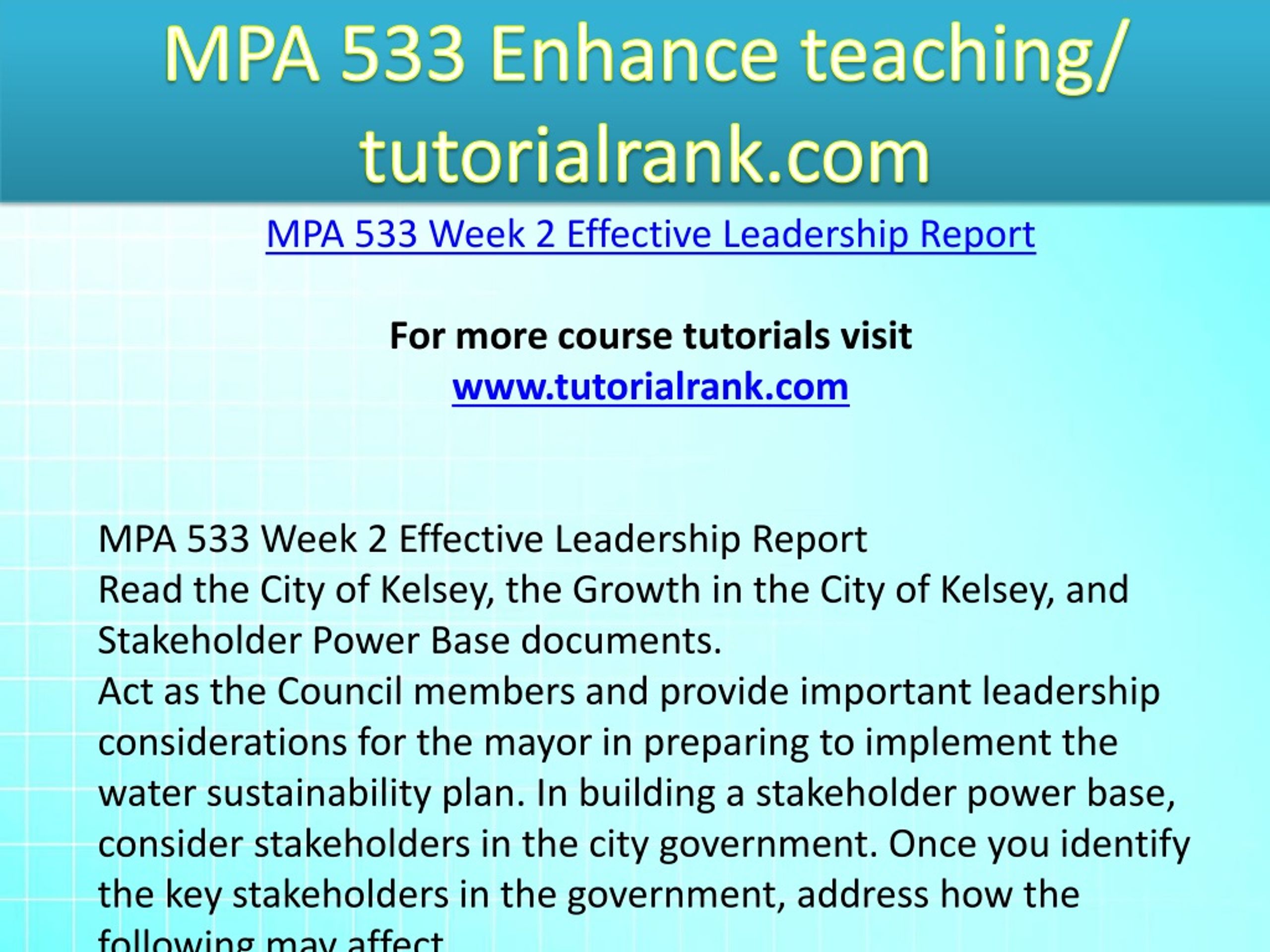 MPA 533 Enhance teaching/ tutorialrank.com MPA 533 Week 2 Effective Leadership Report For more course tutorials visit www.tutorialrank.com MPA 533 Week 2 Effective Leadership Report Read the City of Kelsey, the Growth in the City of Kelsey, and Stakeholder Power Base documents. Act as the Council members and provide important leadership considerations for the mayor in preparing to implement the water sustainability plan. In building a stakeholder power base, consider stakeholders in the city government. Once you identify the key stakeholders in the government, address how the following may affect